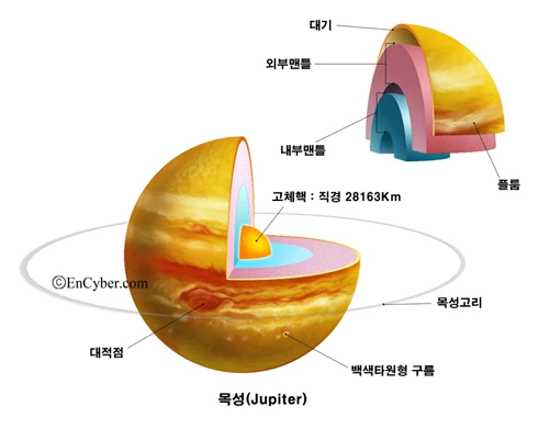 목성은 거대한 기체 덩어리입니다. 우주의 대부분을 구성하는 수소, 헬륨처럼 (수소와 헬륨은 우주의 대부분을 차지합니다. 이때, 수소와 헬륨의 비는 3:1이며 이 비율은 나중에 빅뱅을 입증하는 증거가 됩니다. 이 내용 또한 나중에 다룰 '우주의 역사'에서 다루도록 하겠습니다.) 목성 또한 수소, 헬륨으로 이루어져 있습니다. 그 말은 즉, 목성 표면에 에 깃발은 안타깝게도 꽂을 수가 없습니다.