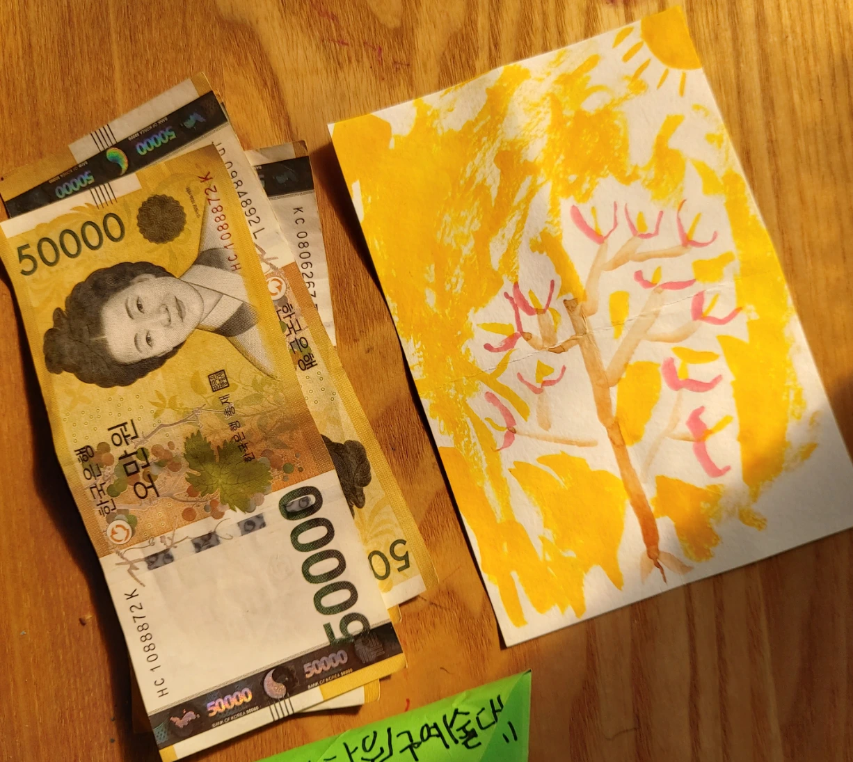 8살 아들은 하루 종일 꼼지락 거리더니, 초가을 목련나무 수채화 작품 한 점과 오래도록 모아 온 세뱃돈 중의 노란 신사임당 종이를 꺼내 바쳤다. 와! 통 큰 녀석! 돈 받았다고만 좋아한 거 절대 아니다. 서툴렀을지언정 내가 완전히 틀려먹지는 않았다고 아들이 증명해주는 것만 같아 마음이 몽글거렸다. 덕분에 어떤 숫자로 환산할 수 없는, 예를 들어 아이가 어릴 적에 함께 만든 추억이나 애착 관계 같은, 무형의 것들만 추구해온 인생이 여러 모로 위로를 받았다.