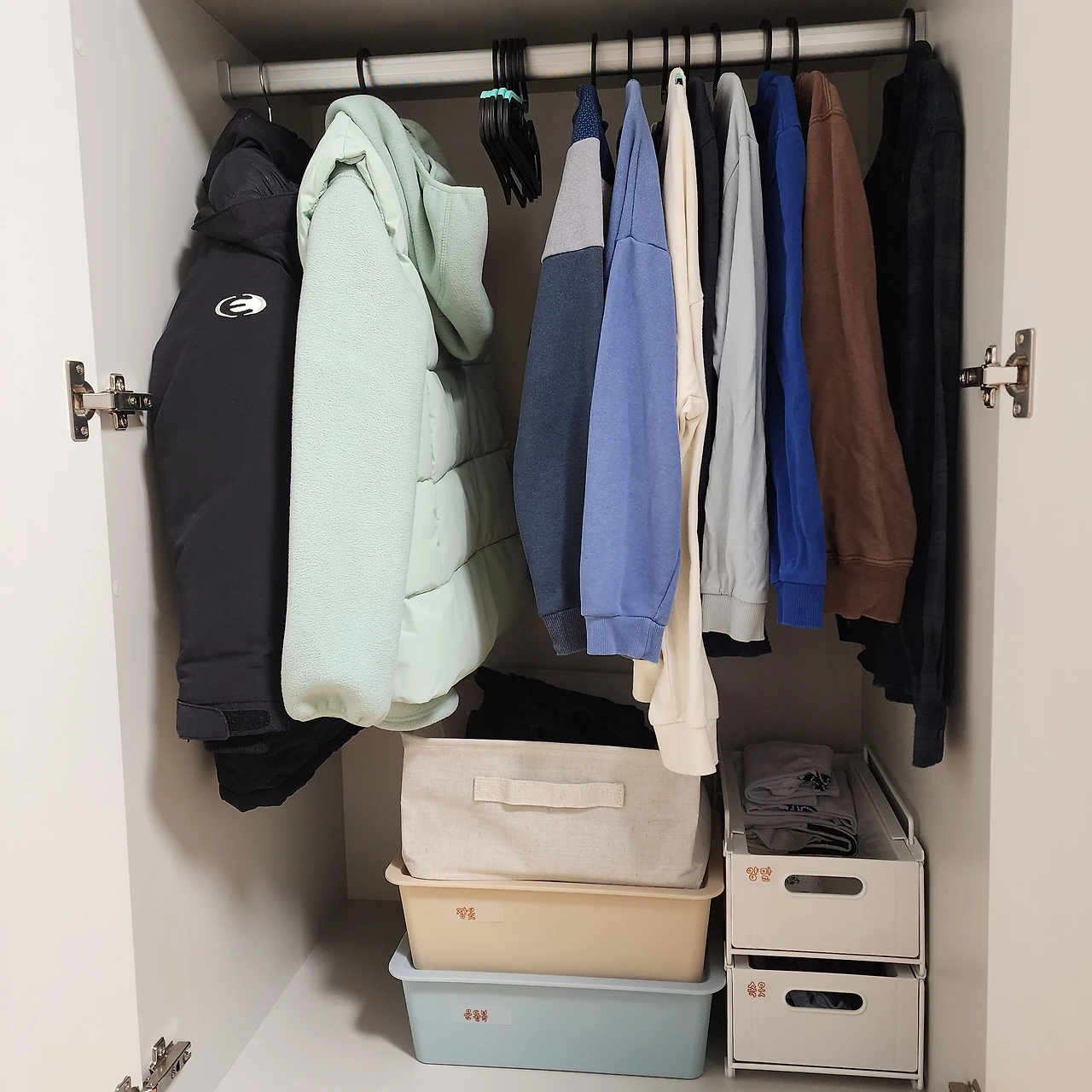 무인양품을 다녀왔다. 다양한 정리 장비들을 구경했고, 집에서 유용하게 쓰고 있는 소프트 의류함을 몇 개 더 사 왔다. 사계절이 있는 나라에서 아이들까지 키우고 있으니, 물려받은 옷, 제철옷 등을 잘 순환시켜 주어야 깔끔한 옷장을 유지할 수 있다. 얼마 전에 가을맞이 옷장 정리를 했지만, 본격적인 추위가 찾아오니 몇 개 남겨두었던 반팔과 얇은 긴팔도 손이 가지 않는다. 그것들을 다 의류함에 수납했다. 공간에 여유가 많다. 옷장문을 열었을 때 딱 필요한 것만 있고 군더더기 없는 모습이 단정하다.