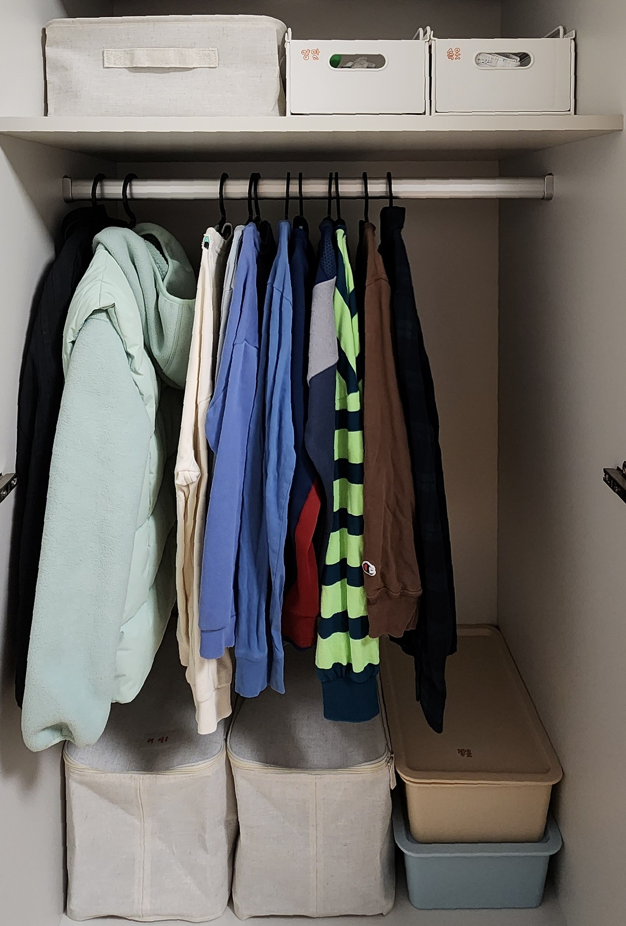 정리를 쉽게 할 수 있는 환경을 설정해 주기로 했다. 먼저 옷장부터 세팅했다. 최대한 아이가 쉽게 정리할 수 있도록 상의는 무조건 옷걸이에 말려서 그 채로 옷장에 가져갈 수 있게 했다. 바지는 큰 바구니에, 속옷과 양말, 잠옷, 운동복은 각각 라벨 붙은 장소에 모셔 넣기만 하면 된다. 어렵게 접는 과정을 최대한 생략할 수 있게 해 준 결과, 빨래 건조대에서 자기 옷을 가져다가 스스로 정리를 잘하는 아이가되었다.