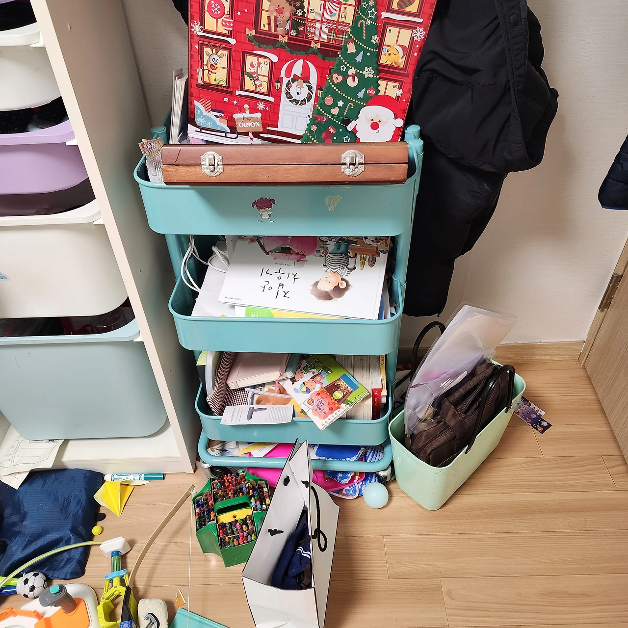 애들 키우는 집에 흔하게 있는 트롤리다. 아무거나 넣을 수 있기 때문이다. 그런데 그런 이유로 많은 집에서 잡동사니 쓰레기통이 되기 쉽다. 우리 집 트롤리는 수 년째 책과 미술도구들, 그림 쪼가리에 파묻혀 바닥을 드러내지 못했다. 방 한 구석에 처박혀 제대로 쓰임 받지 못하고 있었다.