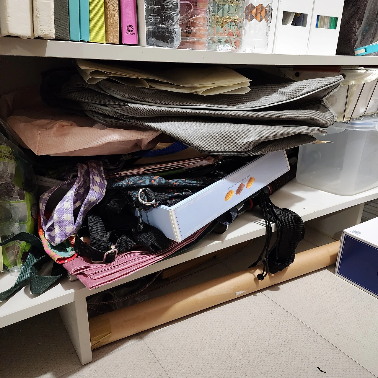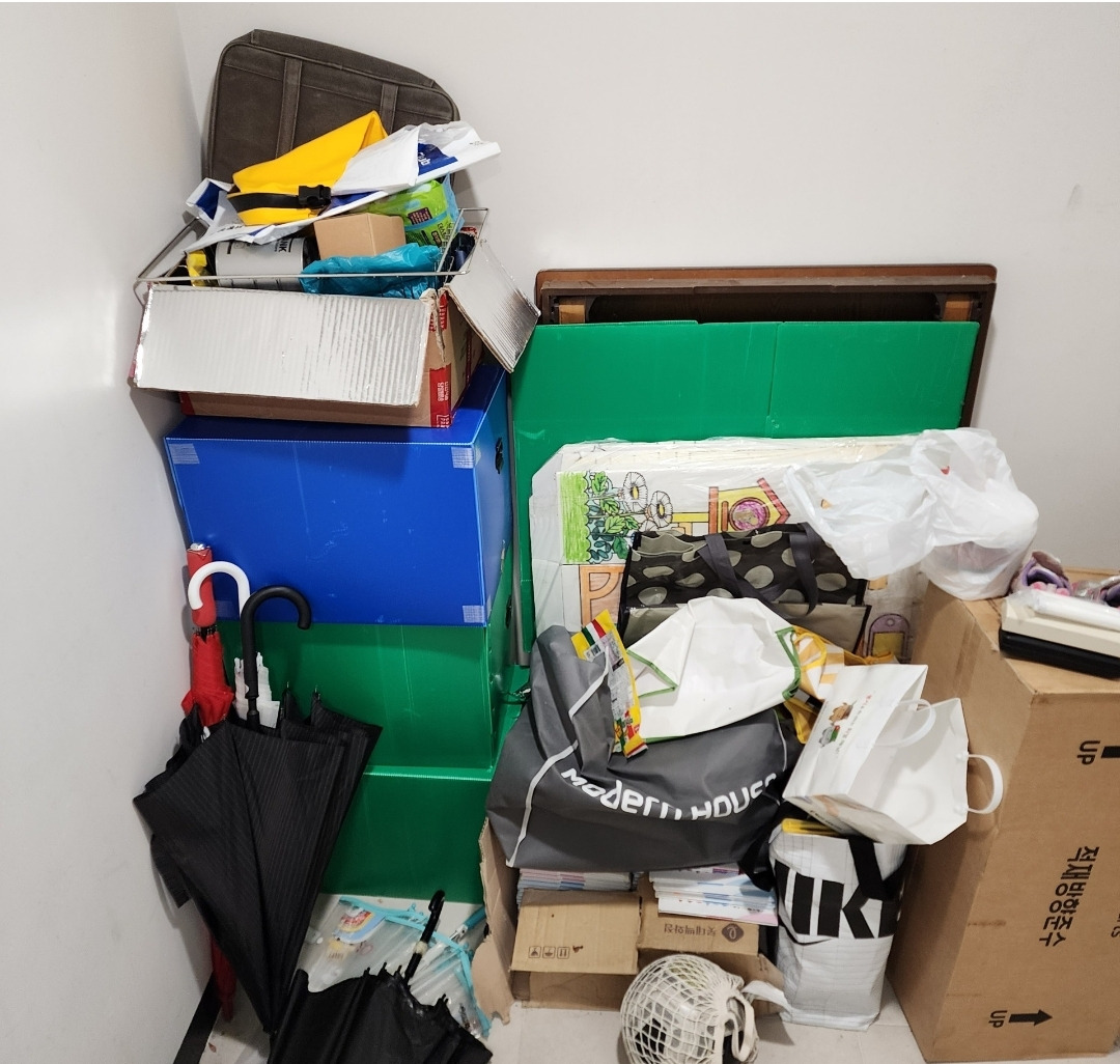 현관 바깥 짐을 치우기 위해서는 팬트리 정리가 연동되어야 한다. 한 단을 통채로 비워야 책을 놓을 수 있다. 가장 쉽게 치울 수 있는 만만한 곳을 골랐다. 여기 저기서 받은 수많은 에코백을 헌옷함에 비웠다. 또, 마트에 가서야 생각나는 장바구니는 미리 현관과 자동차 트렁크에 배치했다.