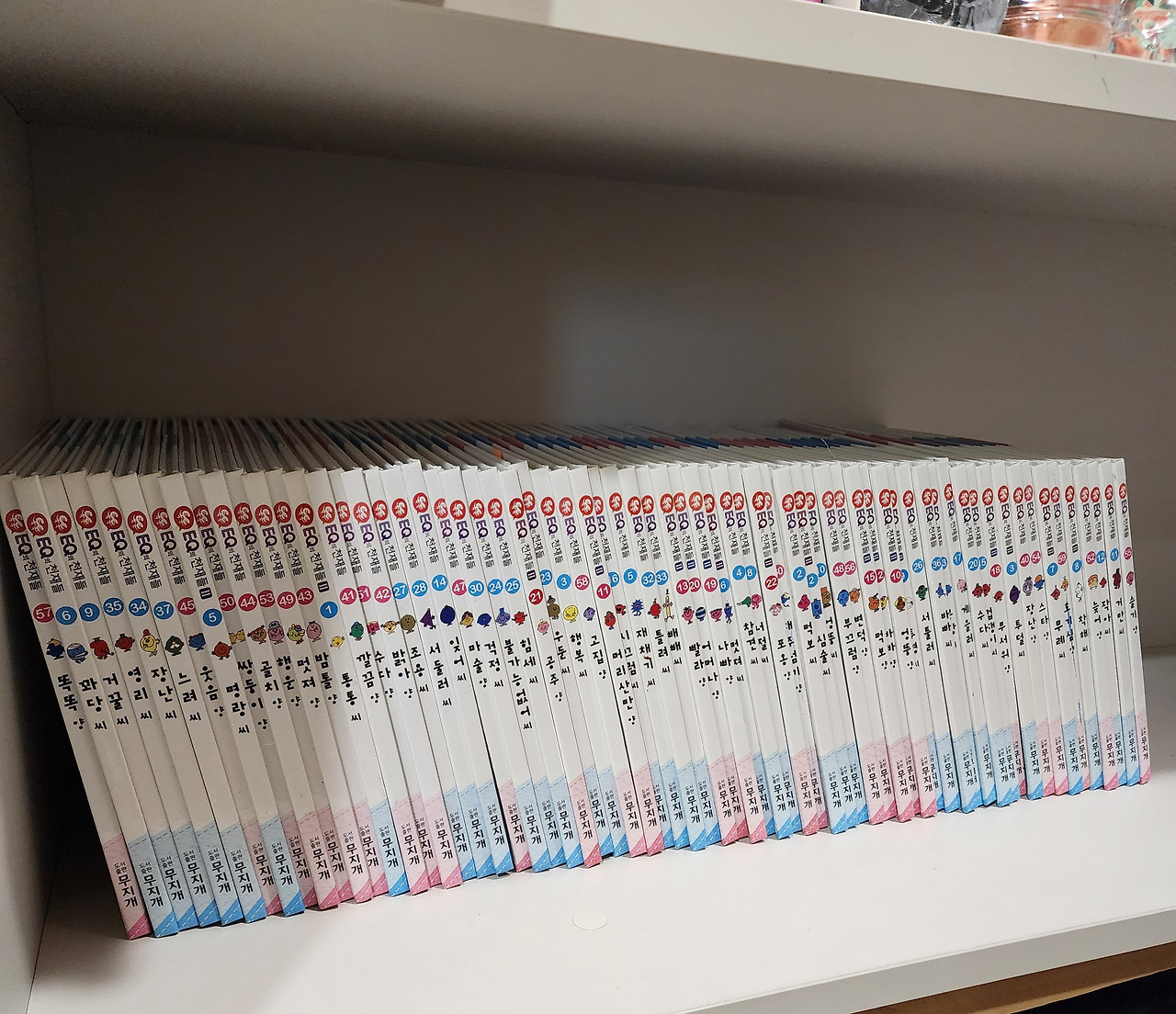 꽂을 곳이 없어서 박스채 밖에 있었던 전집. 강력 유선 청소기로 먼지를 빨아들이고 한 권 한 권 생분해되는 물티슈로 닦다가 포기할 뻔했지만 간신히 끝내고, 완벽히 번호대로 정리하려는 욕구는 잠시 버리기로 했다. 대충대충 할 일에 진을 쏟으면 진도를 못 나간다.