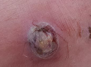 (아래 사진을 보시면 1번보다 2번이 심해보입니다. 그러나 1번 사진의 환자분은 복숭아뼈 얇은 피부였는데 통증이 없었습니다. 2번 사진의 환자분은 위에 부분을 긁어내니 통증을 느끼셨습니다. 실제로 2번 환자분이 훨씬 빠르게 회복했습니다.)