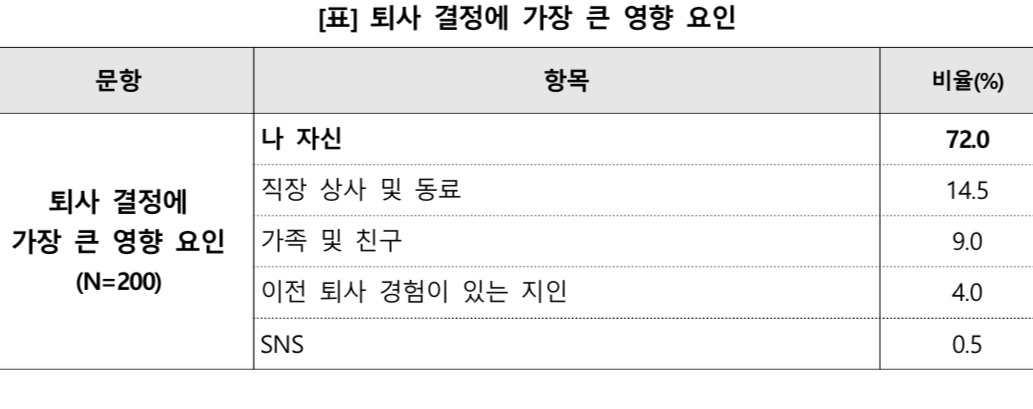 그리고 놀랍게도, 퇴사에 영향이 가장 큰 요인은 바로 “나 자신” 이 72%를 차지했다.