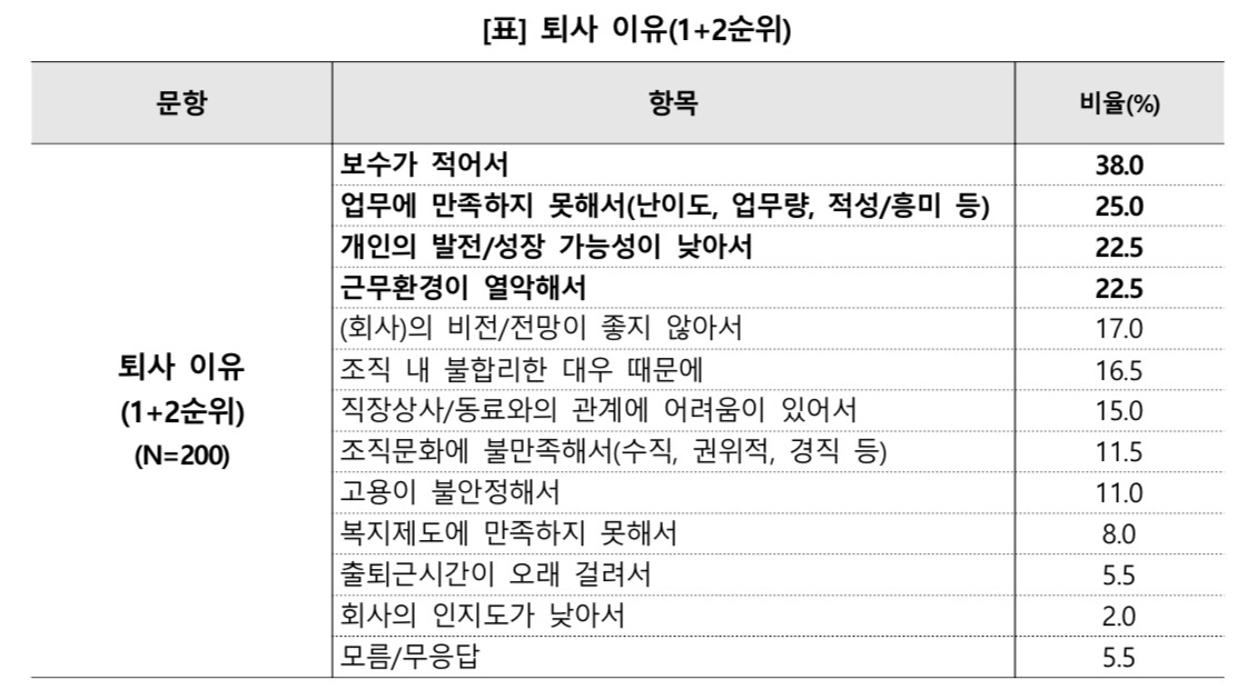 그리고, 퇴사 이유에서 보수가 적어서 가 38%로 단연 1위를 차지했다.