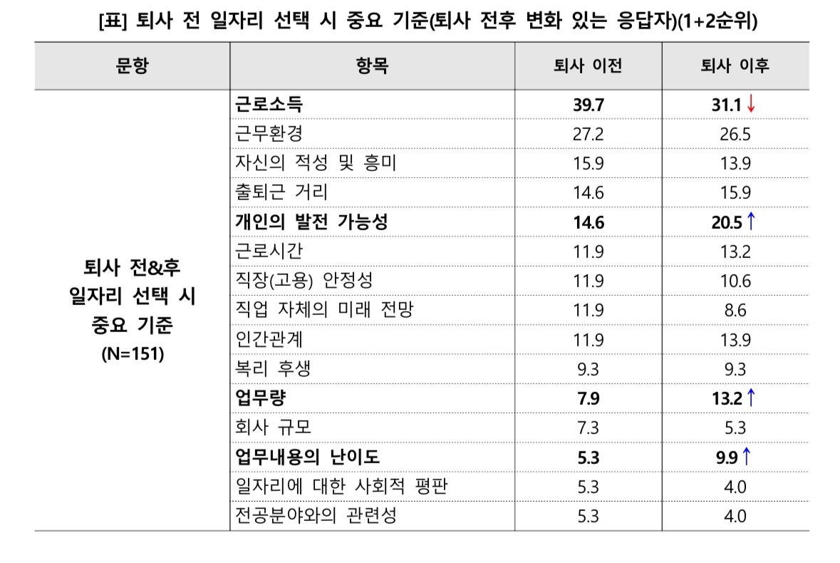 퇴사 이후에 여전히 소득은 가장 중요한 기준임엔 틀림없지만 가장 두드러지게 하향하였고, 개인의 발전 가능성은 20.5%로 약 6%나 상향되었다.