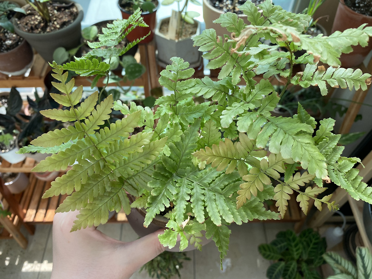 세 번째 이유는 이사를 하고 명확해졌다. 이사는 평수가 훨씬 커지고, 베란다가 생겼으며, 고로, 대부분의 식물들이 베란다로 이사를 갔다. 방에 남은 식물은 몬스테라나, 손이 많이 가는 식물, 그리고 고사리가 남았다. 그런데 이사 적응이라는 이유만으로는 설명되지 않을 만큼 고사리 잎사귀가 타 들어갔다. 그리고 그건 나도 느꼈다. 방이 매우 쾌적하고 동시에 건조하다는 것을. 식물이 빠진 만큼 방안 식물 밀도가 낮아지면서 집안의 습기가 훨씬 낮아진 것이었다. 대신 베란다 습도는 언제나 80 이상을 유지하며 물 만난 고기처럼 아주 신나 있었다.