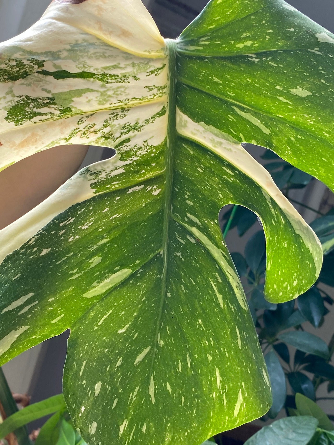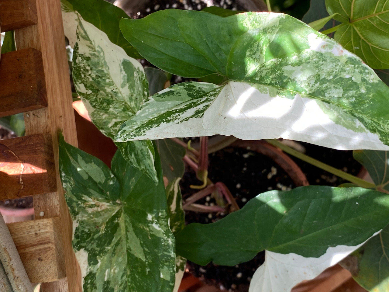 온화한 해를 예민한 위치에서 잘 받아야 하는 식물들 중 ‘무늬’가 들어간 아이들이 있다. 무늬몬스테라, 무늬싱고니움, 무늬아단소니, 무늬바로크벤자민, 무늬아랄리아, 필로덴드론 버킨, 무늬라벤더, 무늬산호수 등 이중에선 몇 십 만원, 혹은 백만원을 넘는 가격을 자랑하며 위상을 떨치는 식물들도 있다. 무늬가 있다는 것은 보통, 초록 잎 베이스에 흰 무늬가 들어가는 것을 말한다. 예를 들어 무늬 몬스테라같은 경우, 흔한 몬스테라는 거대하고 구멍이 송송, 잎이 찢어진 초록 잎이 유명하다. 여기에 흰색 물감으로 칠한 듯한 무늬가 들어간다고 생각해보자. 얼마나 귀하고 아름다워 보이겠는가. 흰 부분이 많을수록 귀하고 예뻐보이기 마련이다. 다만 치명적인 부분은 흰 무늬 부분은 광합성을 못한다는 것이다. 쉽게 해에 타기도 한다. 이를 조절하기 위해서 집에 드는 해의 하루 일대기를 파악하고(주말 하루 집에서 뒹굴뒹굴 하면 금방 파악이 된다) 그에 알맞은 자리를 찾아준다.
