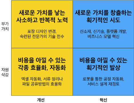 정리해보자. 시간, 인력, 자원은 무한하지 않기에, 일을 조망해야 한다. 전쟁터를 위에서 내려다보는 사령관의시야가 필요하다. 이가 야스요는 아래의 프레임워크를 제시한다. 자원 삭감과 부가가치 창출을 위한 개선과 혁신. 이 틀에 맞춰 자신의 업무를 구분하고 ‘제약 사항’을 찾으면, 목표와 전략이 수정된다. 일의 순서를 바꾸는 수준부터, 전혀 새로운 기술을 개발해야 되겠다는 발상이 떠오를 수도 있다. 전략 수립이 끝나면 다시 전장으로 복귀한다. 제안서를 써야 할 수도 있고, 자신만의 업무 방식을 바꿀 수도 있다. 어쨌든 나가서 싸워야 한다. 한 손에는 기존의 일을 다시 바라보는 관점(개선)을, 다른 한 손에는 기존에 없는 일을 상상해보는 담대함(혁신)을 들고 말이다. 관점이 달라지면, 인식이 바뀐다.
