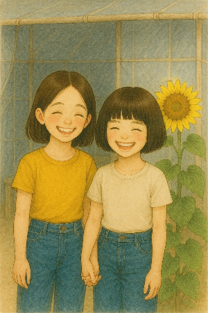 그녀 옆으로 노란 해바라기가 껑충하게 서서 우리를 바라보고 있었다.