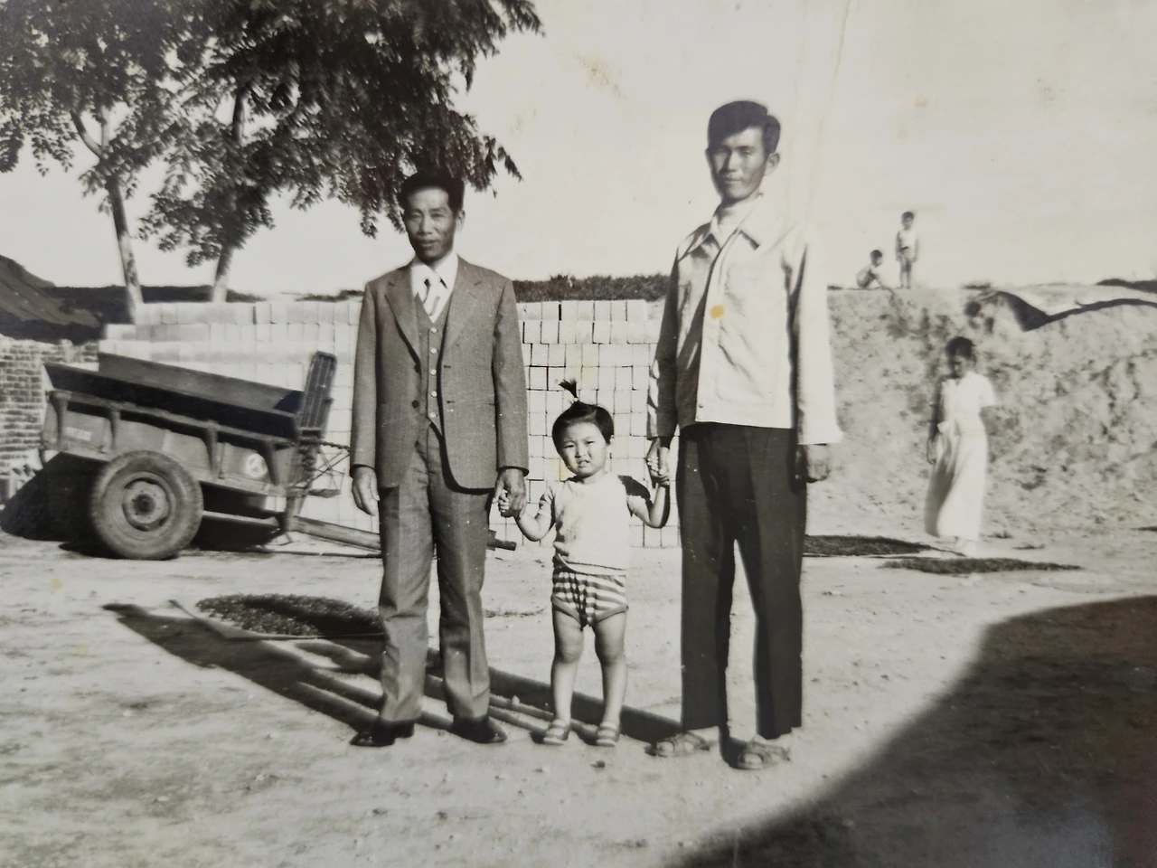 (왼쪽부터)외삼촌할아버지 함용배 님, 필자, 필자의 아빠 심재문 님. 멀리 둑 위에 차렷자세로 서있는 아이가 필자의 오빠라는 사실이, 이 글을 올리고서야 밝혀졌다. 남매는 4년 여후 저 둑을 난다.