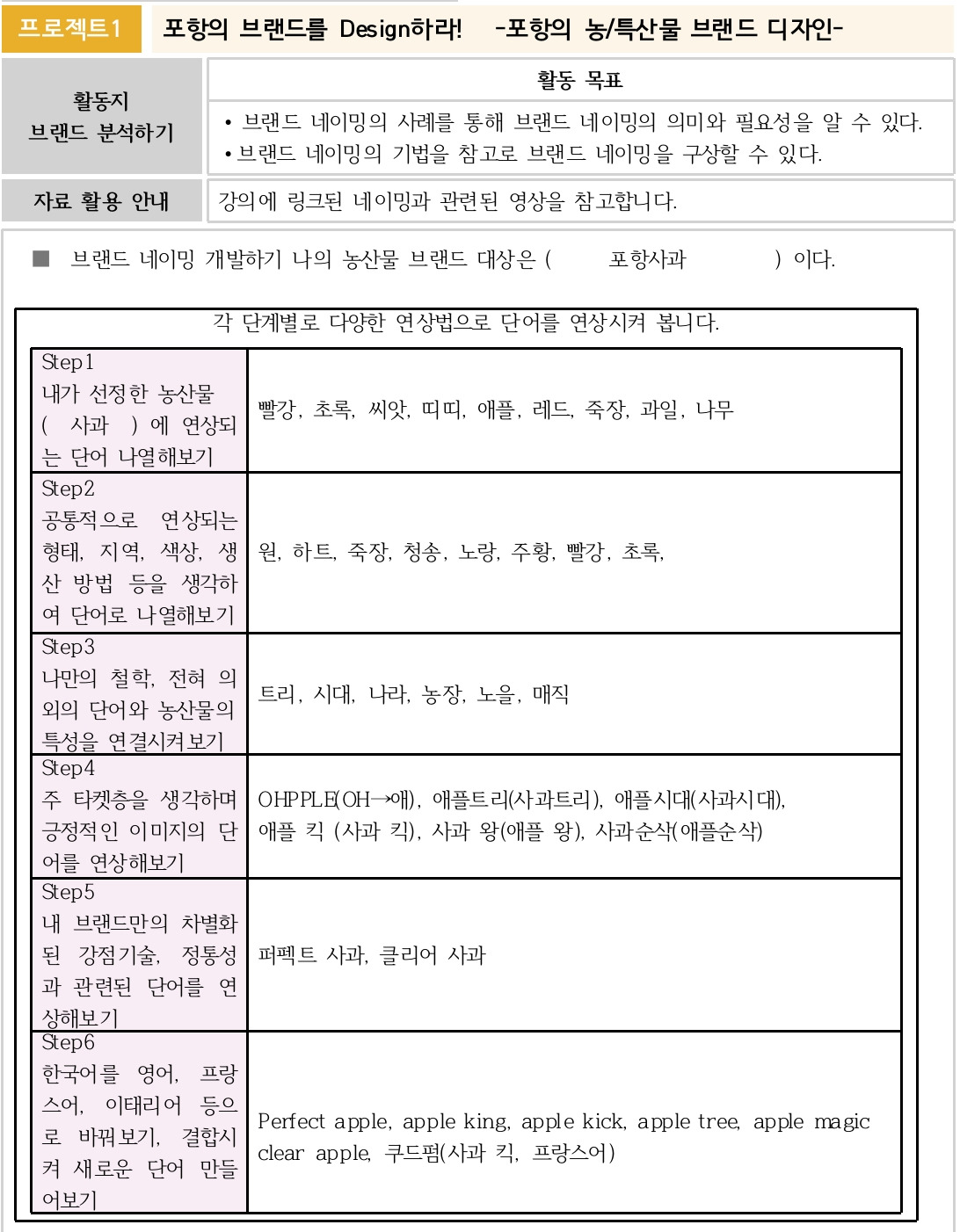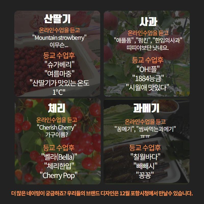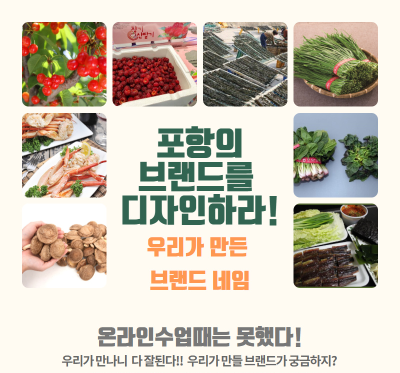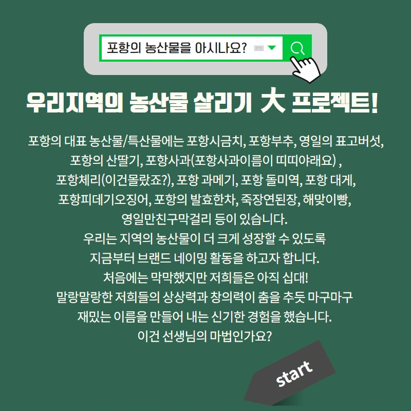 포항 지역의 주요 농산물과 특산물에는 어떤 것이 있는지 알고 있나요? 포항 과메기, 포항 시금치 , 장기 산딸기 정도 생각날 거예요. 여러분과 선생님이 함께 나눌 이번 프로젝트는 포항지역의 농산물, 특산물 브랜드 디자인입니다!