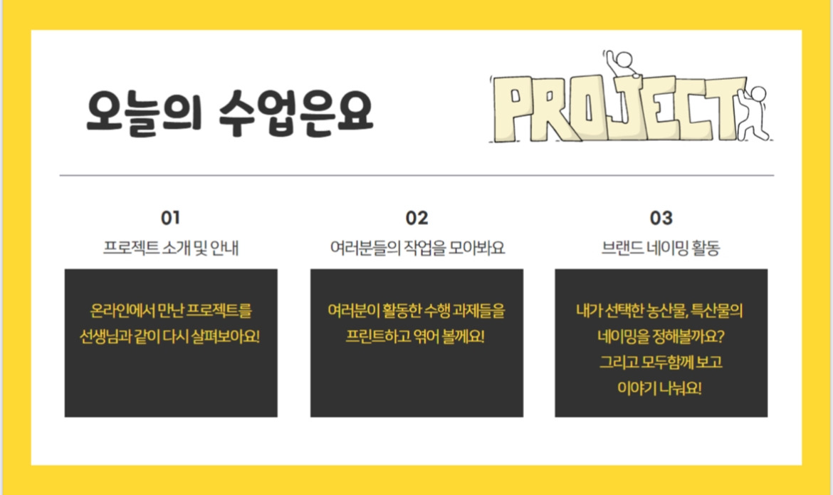 그리고 대면 수업을 시작하며, 기존에 가지고 있던 관념을 깨는 것에 초점을 두고 계속해서 발상을 깨우는 질문들을 하였다. 이것은 전체 활동 안내 후 개별 피드백 형식으로 질문과 공감을 통해 네이밍을 선정할 수 있었다.