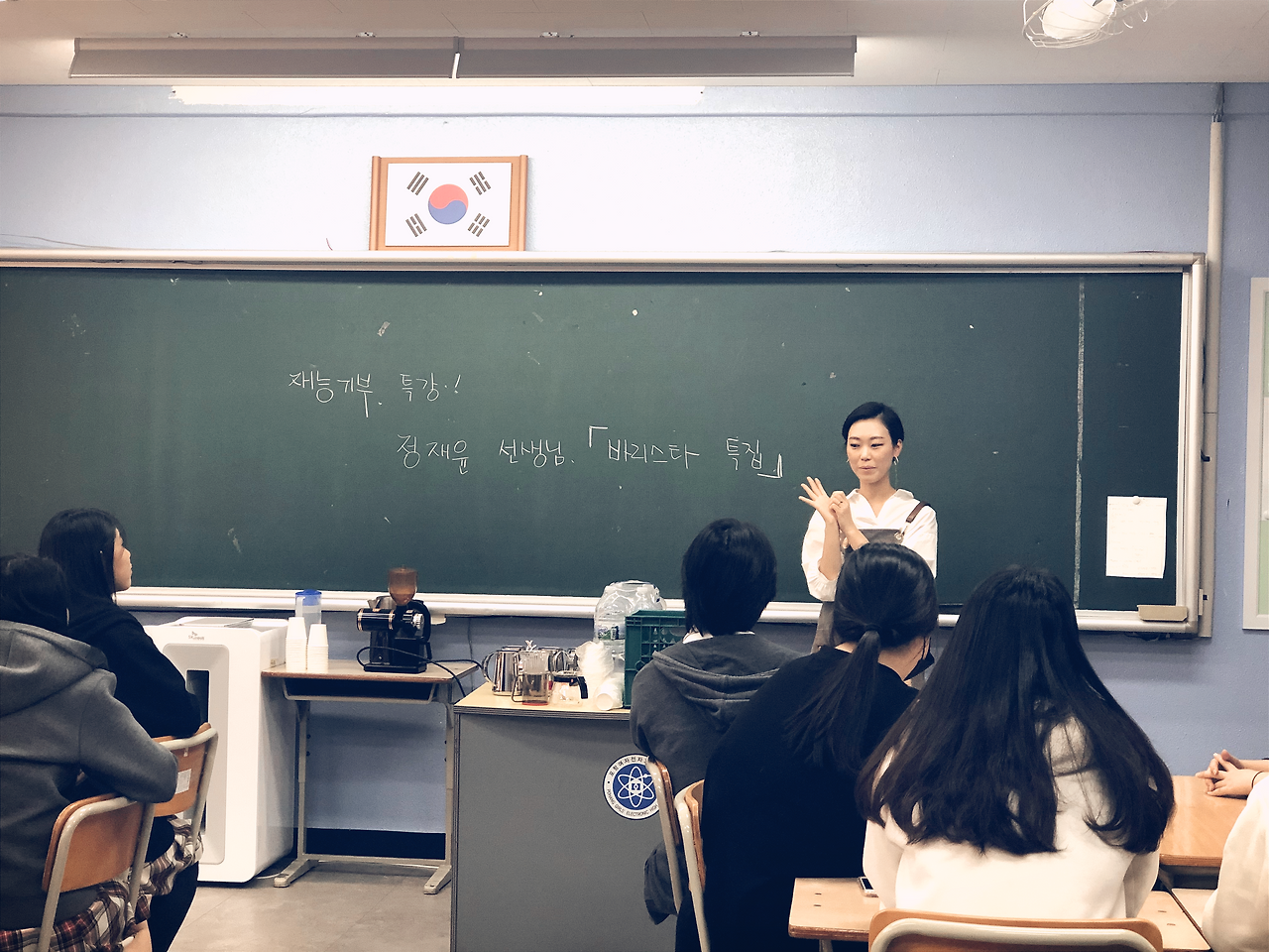 첫 번째 날, 세상에서 하나뿐인 특강! 바리스타 선생님의 이야기이다. 꿈과 도전에 대하여 아이들에게 메시지를 전하셨다. 강사 선생님은 나의 선생님이시기도 하다. 휴직 기간 바리스타 자격증을 땄는데, 그때 선생님과 함께 했었다. 그것이 인연이 되어 선뜻 재능기부를 해주신다고 연락이 오셨다. 선생님은 아이들에게 작은 도움이라도 되고 싶은 마음으로 이 자리에 서섰다. 선생님의 열정 가득한 강의와 바리스타 체험을 해 본 아이들의 눈빛이 반짝이기 시작했다.