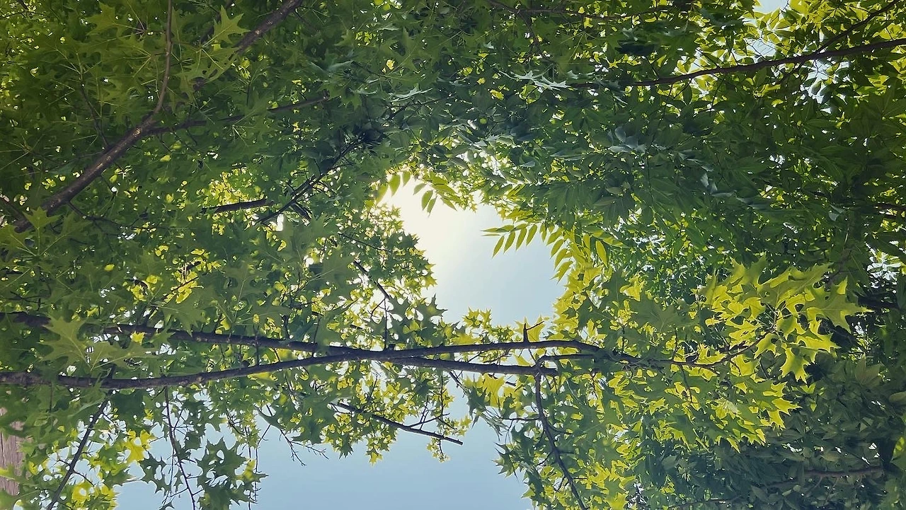 짙은 파랑의 하늘과 초록의 나뭇잎들을 스치며