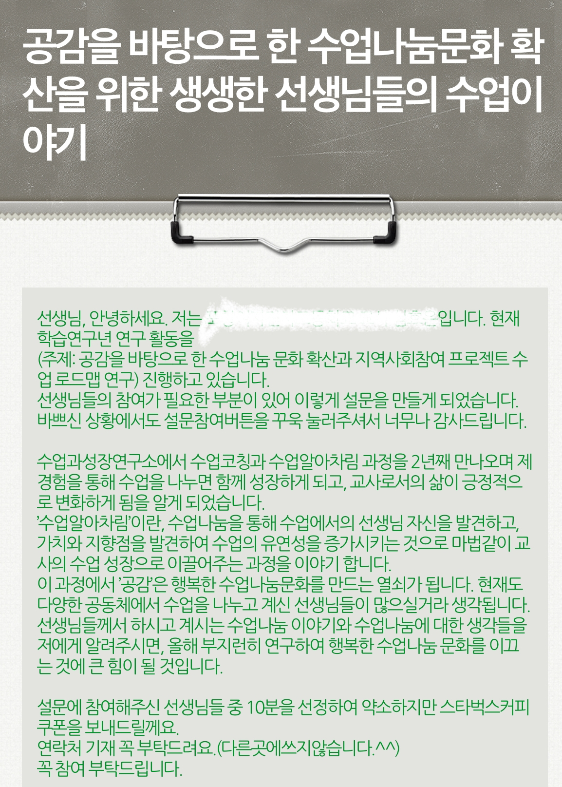 바쁘고 정신없는 학교현장에서 나 또한 학교 밖의 누군가에게 그와 비슷한 내용의 설문 부탁의 메시지를 받아보았기에, 부탁드리기가 너무 죄송스러웠다.