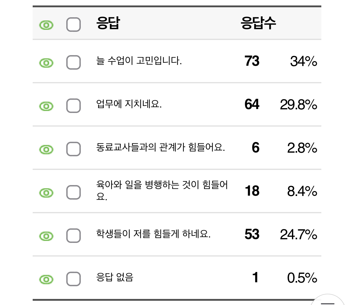 그리고 설문의 문항 중 "선생님의 학교생활에서 가장 어려운 부분은 무엇인가요?"라는 항목에 이렇게 선생님들께서 응답해 주셨다.