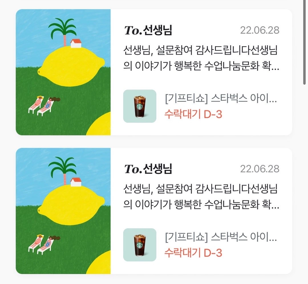 그 마음을 담아 메시지 내용을 작성하였고, 특별히 참여해주신 선생님들 10분을 선정하여 커피 쿠폰을 증정한다는 내용도 함께 넣어 메세지를 전송하였다. 학교에서 고군분투하시는 선생님들께 마음을 그렇게나마 전하고 싶었다.