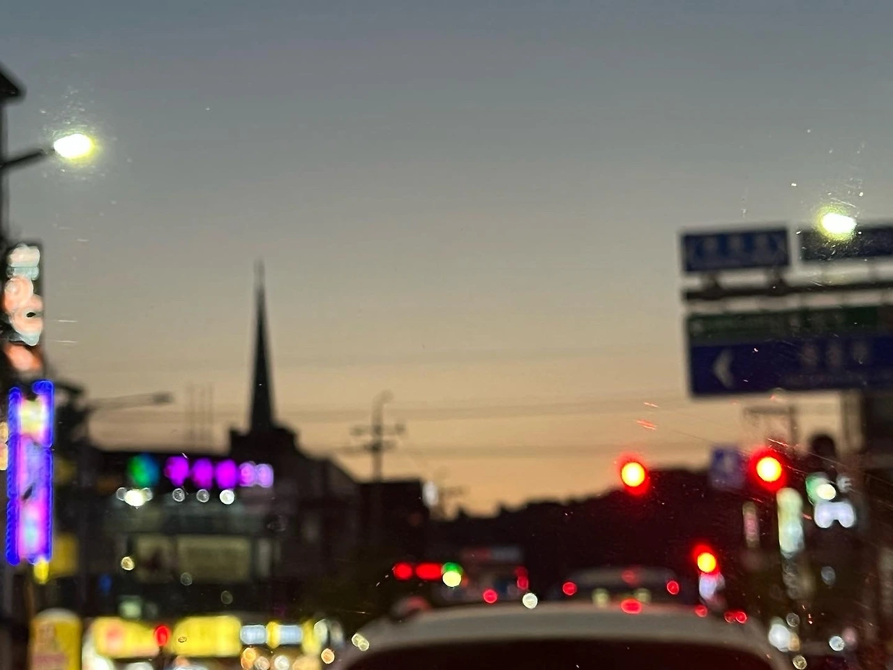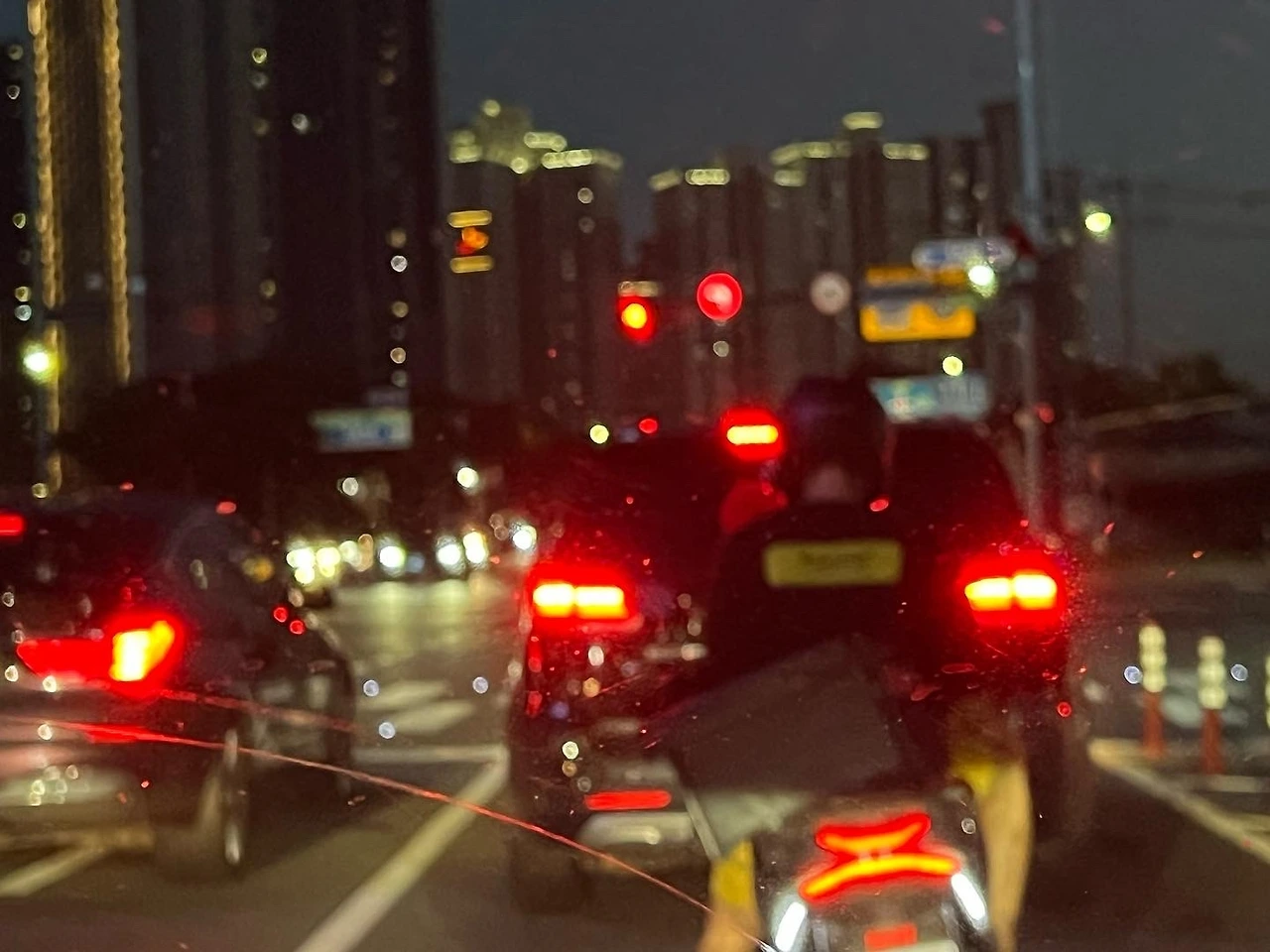 저녁시간에 운전을 하며 신호등이 빨간불일 때