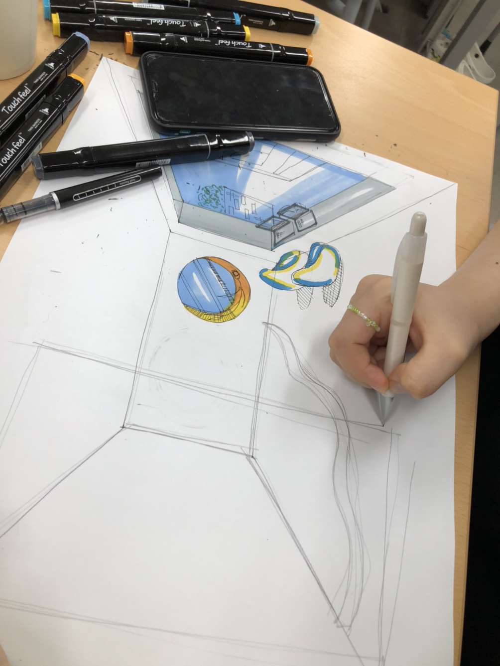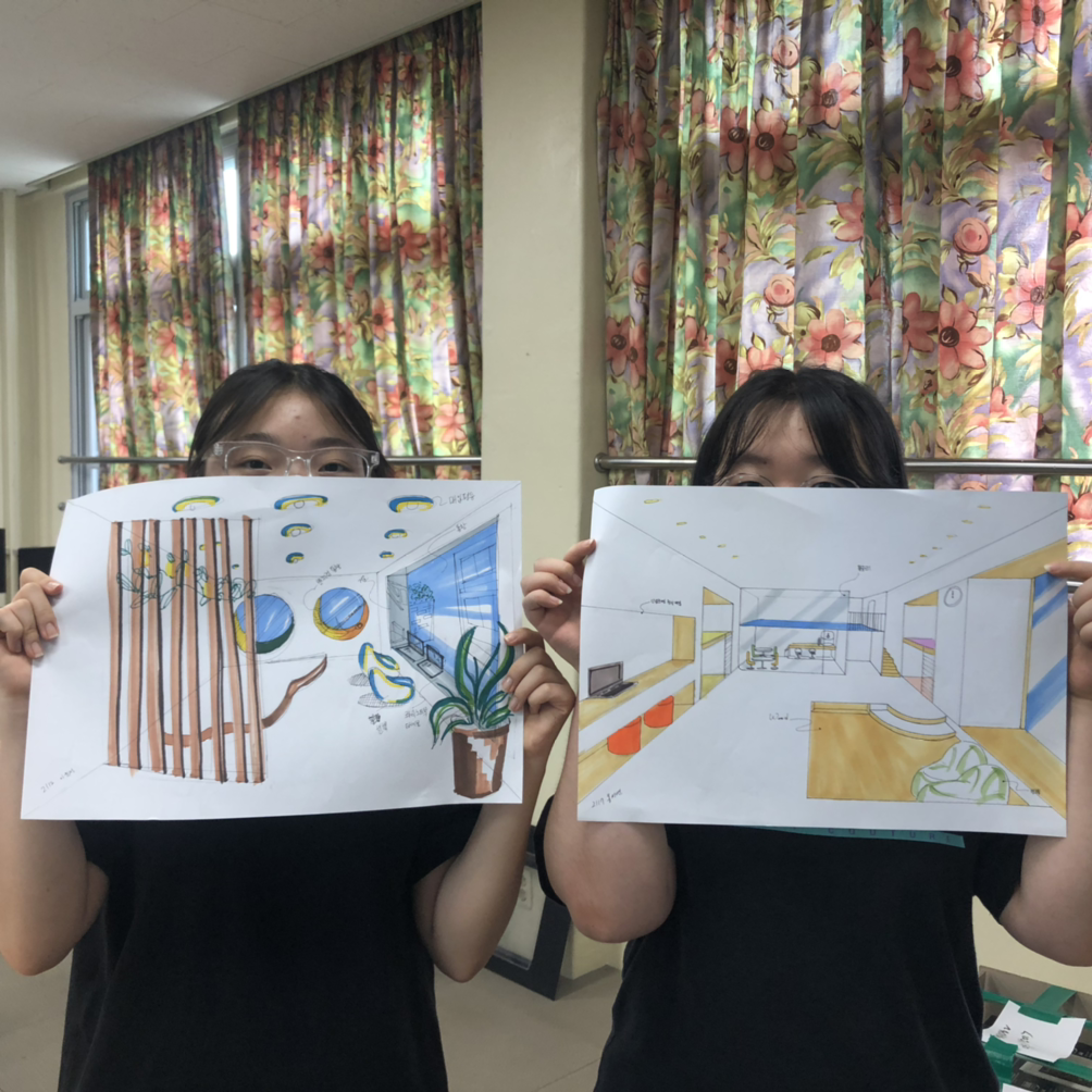 콘셉트를 구상하고 개별적으로 공간을 스케치하고 색도 담아 보았다. 투시의 개념이나 마커의 사용법이 완벽하진 않았지만 최선을 다해 우리만의 공간을 상상하고 상상을 표현한 멋진 작품들이다. 공간을 표현하며 서로의 작품에 감탄하고 콘셉트와 아이디어를 주고받으며 그렇게 종이 한 장에 꿈을 담았다.