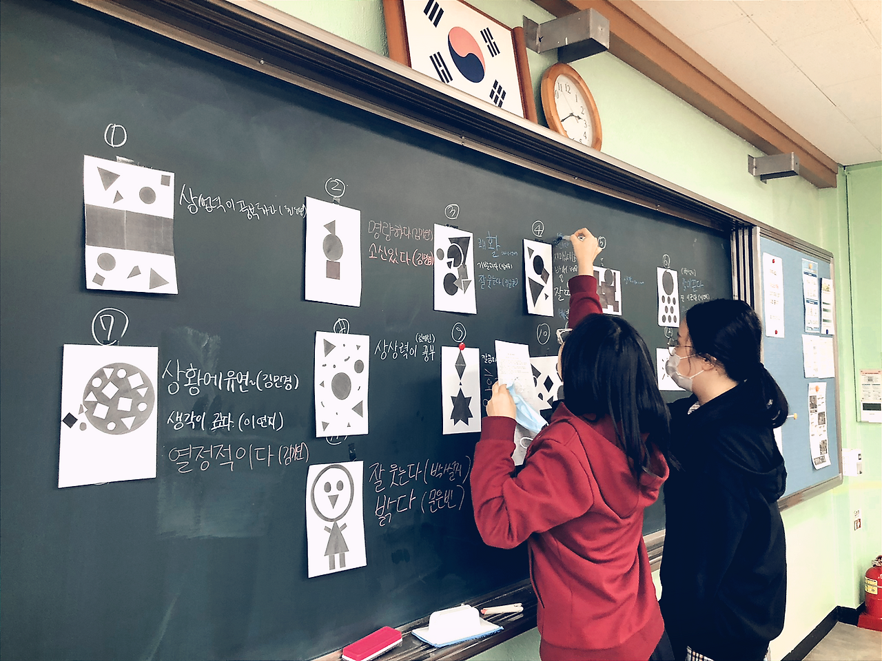 ▪ 결과물 칠판에 부착, 친구들의 작품을 보고 두 가지 작품을 선정하여 의미를 생각하여 떠오르는 강점 1가지 적어보기 (시각언어의 표현, 정확성 체크)