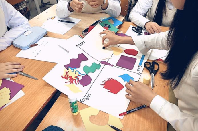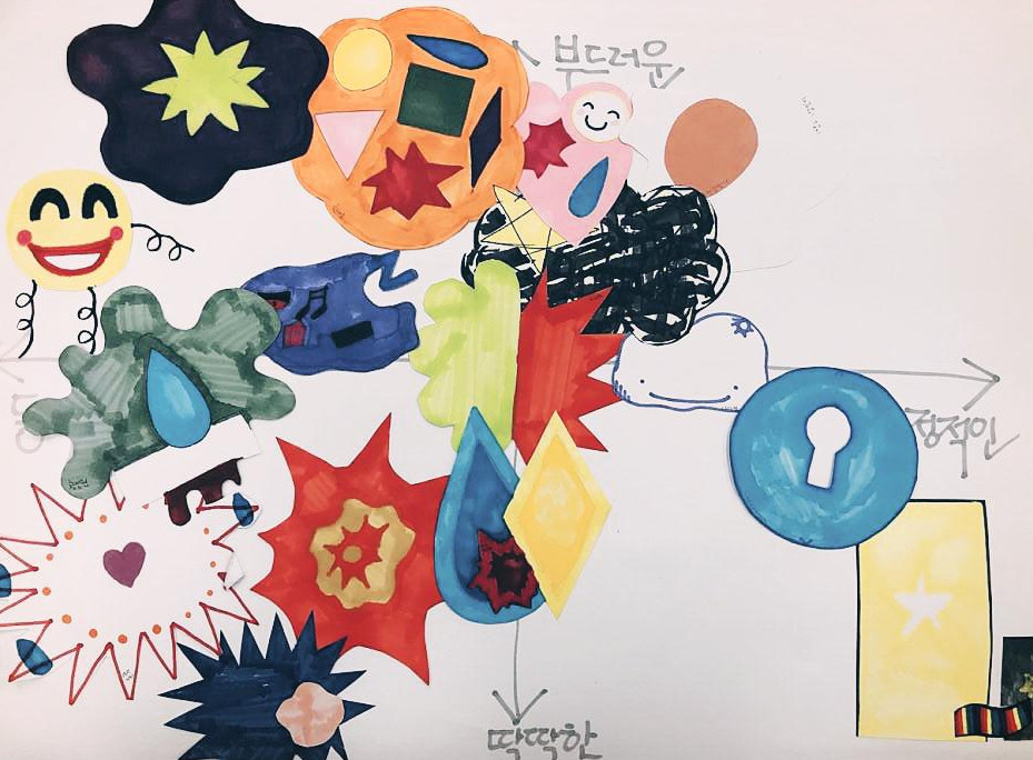 1) 성격과 관련된 형용사를 각 모둠에 배부한다. 모둠장의 진행하에 각자 5개씩의 형용사 단어를 맡아서 제공된 색지로 컬러를 선택하고 형태를 구상하여 그 형용사를 상징하는 도형을 제작한다. 이때 도형이 추상적이어야 한다. 해당 단어의 의미를 담을 수 있도록 지도한다.
