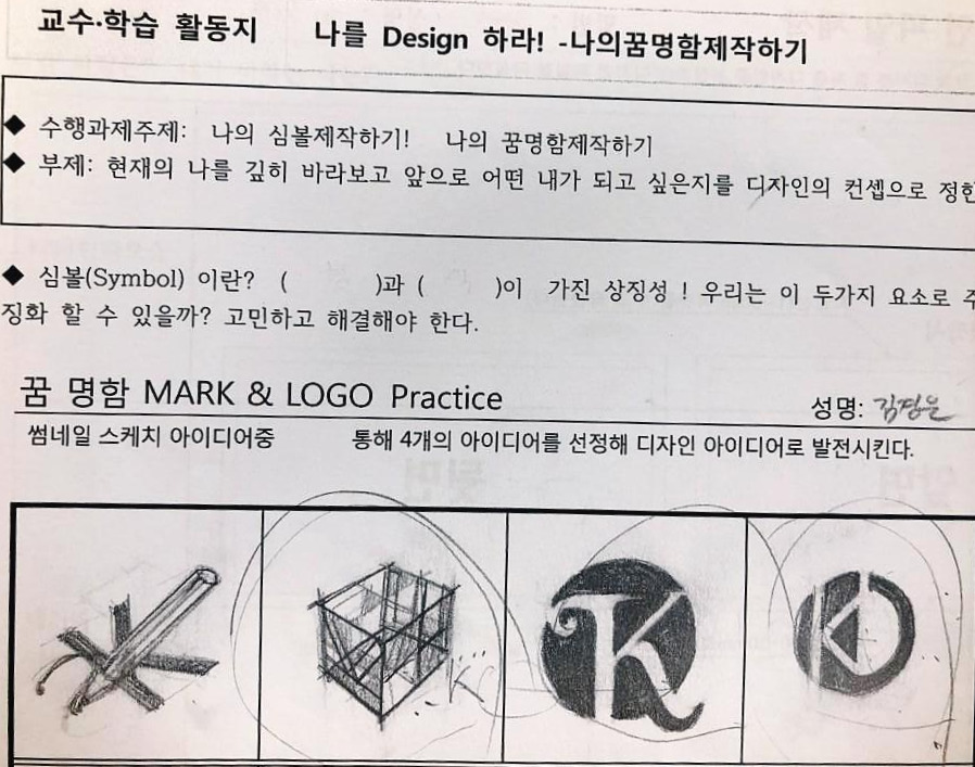 앞서 한참을 들여다본 나의 탐색 시간이 있었기에 콘셉트 설정은 자연스럽게 쉽게 만들어졌다. 그리고 이어진 아이디어 스케치 활동에서 리서치한 심벌의 방향을 참고하여 자신을 상징하는 형태의 심벌을 스케치하였다.