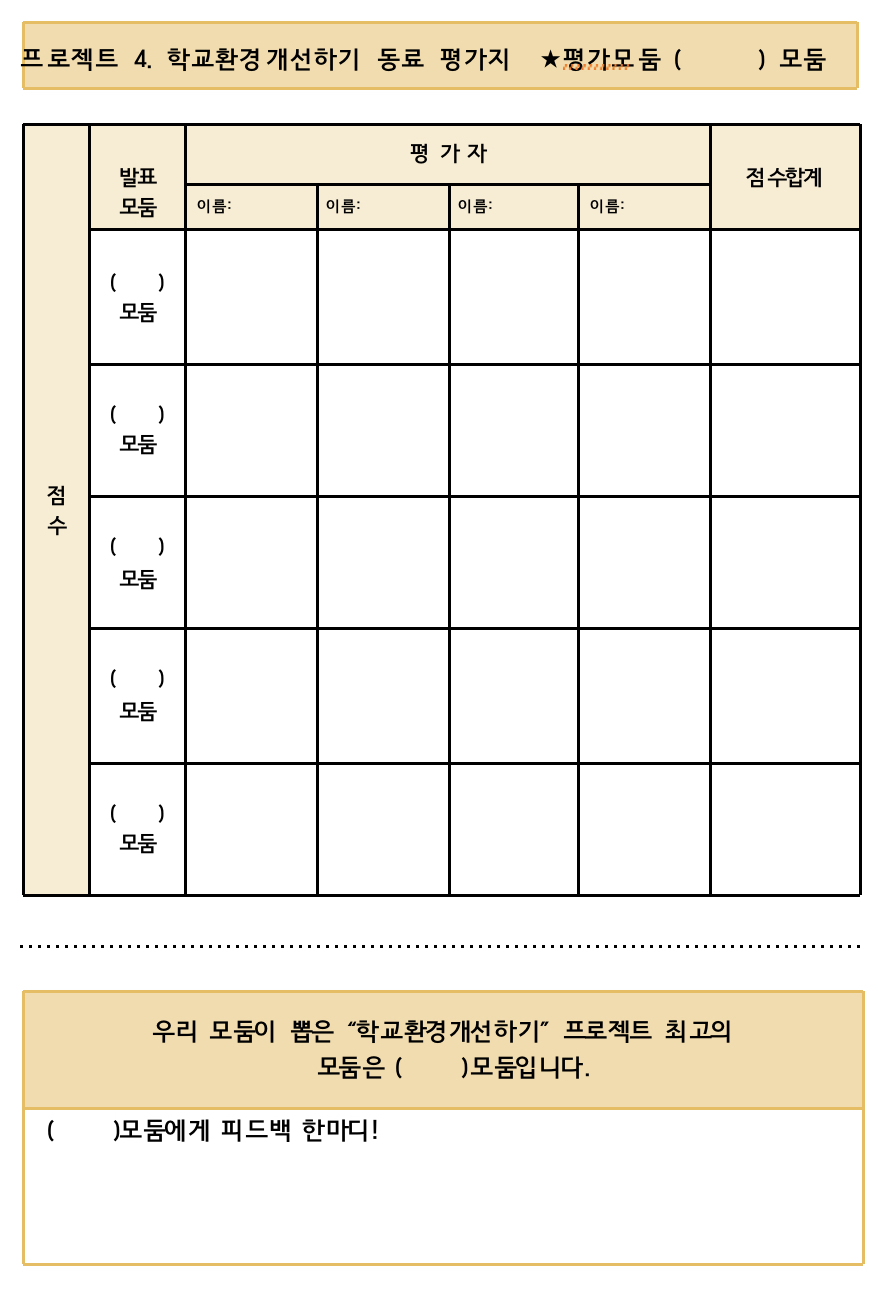 발표하는 모둠의 평가를 개별로 , 그리고 모둠에서 수합하여 최대한 객관적으로 우리가 스스로 하는 평가를 기획하였다. 평가 점수가 가장 높은 모둠에게는 ‘치킨’을!