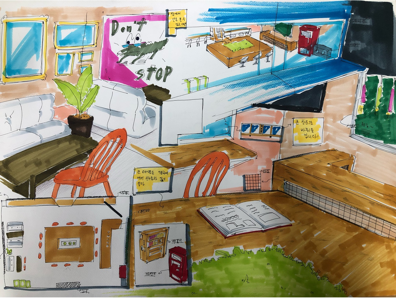 Q. 더 나은, 더 즐거운 학교생활을 위해서 현재 우리 학교 시설과 주변 환경에서 개선했으면 하는 공간을 찾아 아래 그려보거나 적어보고 그 이유도 함께 설명해보자.