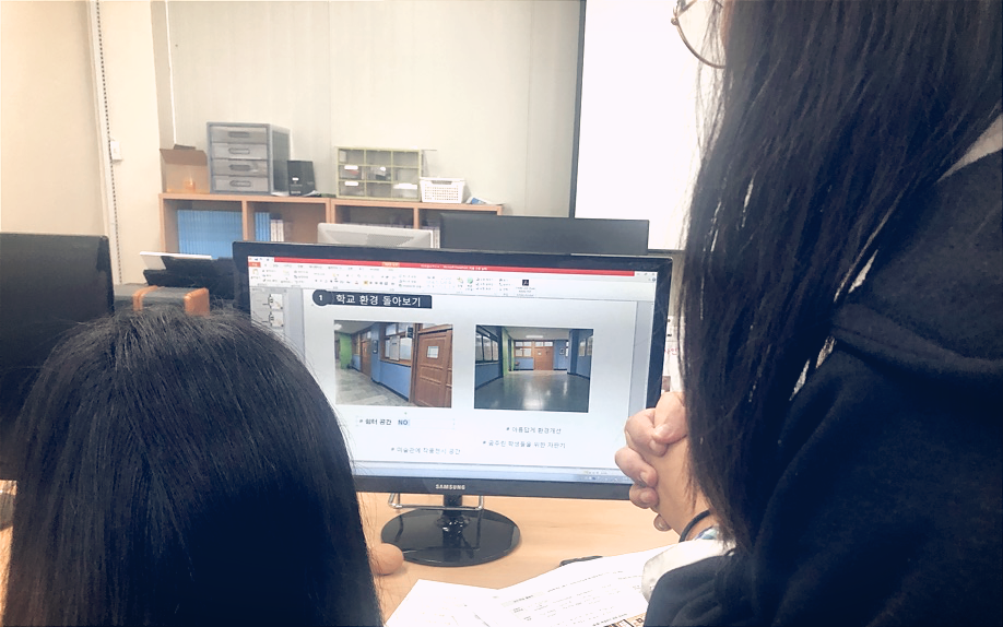 아이들은 학교 공간의 문제점을 발견하고 사진을 촬영하여 업로드하였고 함께 사진을 보며 이야기를 나누었다.