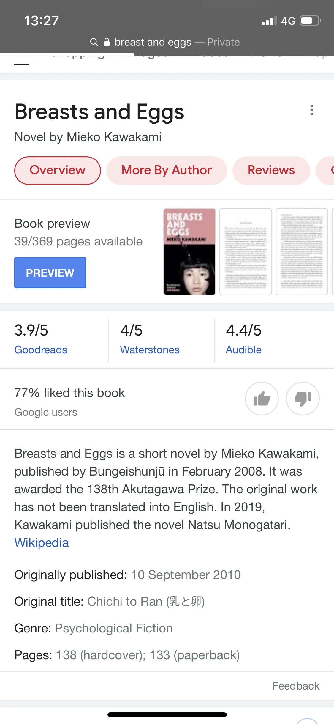 이건 일본에서 한참 전에 인기를 끌었던 페미니즘 소설인데 이제 막 영국에서 번역이 되어 화제라고 한다. 린카가 수강하는 교수님이 추천하셔서 읽어보려고 했는데, 오히려 일본어 원어로 적힌 책을 구하기가 어려워서 해외배송 시켰다며.