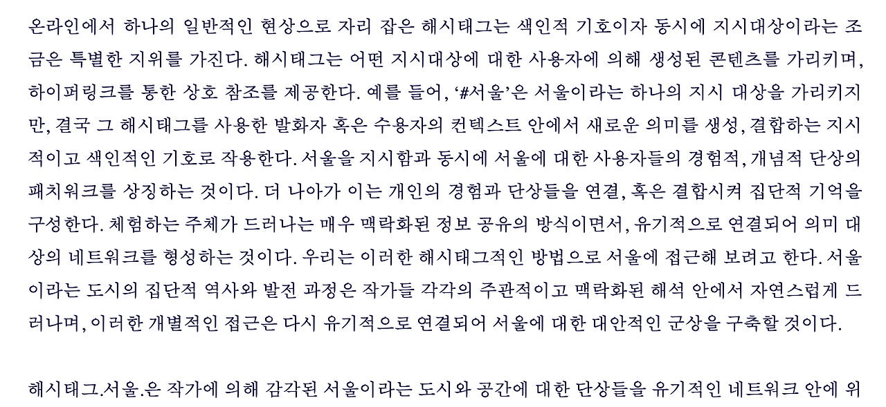 해시태그 서울이라는 서울시립 전시의 서문에서 '해시태그'라는 동시대에 새로 생겨난 기호에 대한 글 발췌. 예전에 전시명만 들었을 땐 너무 직관적이지 않나 싶어서 촌스럽다는 생각이 들었는데 이 서문은 또 참 좋더라.