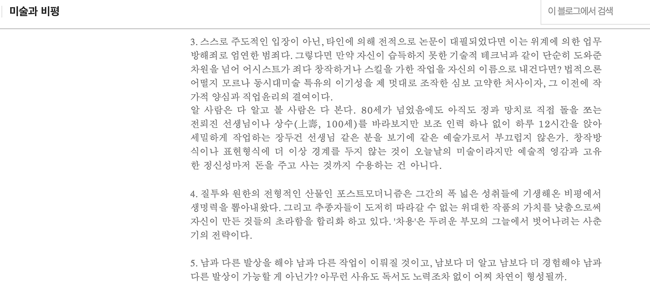 홍경환 선생님이 쓰신 글은 늘 좋아하고 공감하는데, 유독 4번이 흥미로웠다. 포스트 모더니즘에 대해 '도저히 따라갈 수 없는 위대한 작품의 가치를 낮춤으로써 자신이 만든 것들의 초라함을 합리화..'라고 서술한 부분.