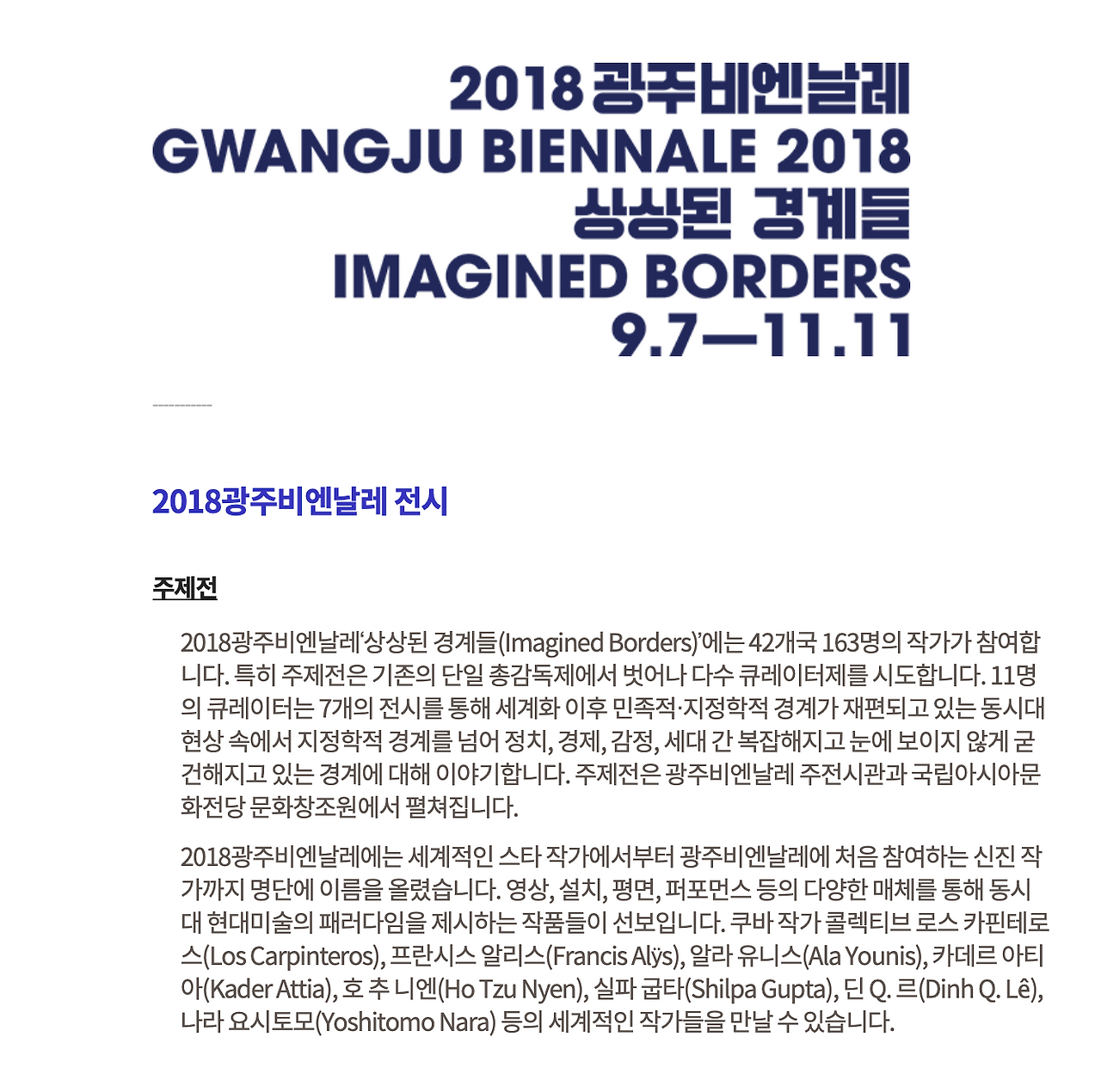 이 비엔날레는 심지어 내가 전문가 재 교육과정으로 심포지엄, 라운드테이블 참여도 하고 전시도 빠짐없이 다 봤었는데 전체 주제가 이런 줄도 몰랐다. 사실 이때 각 큐레이터들의 전시가 묶이지 않고 따로 논다는 혹평과 논란이 많았던 비엔날레였기도 했다. 그래서 그런지 오히려 전체 주제에 대해서는 왠지 금시초문인 느낌.