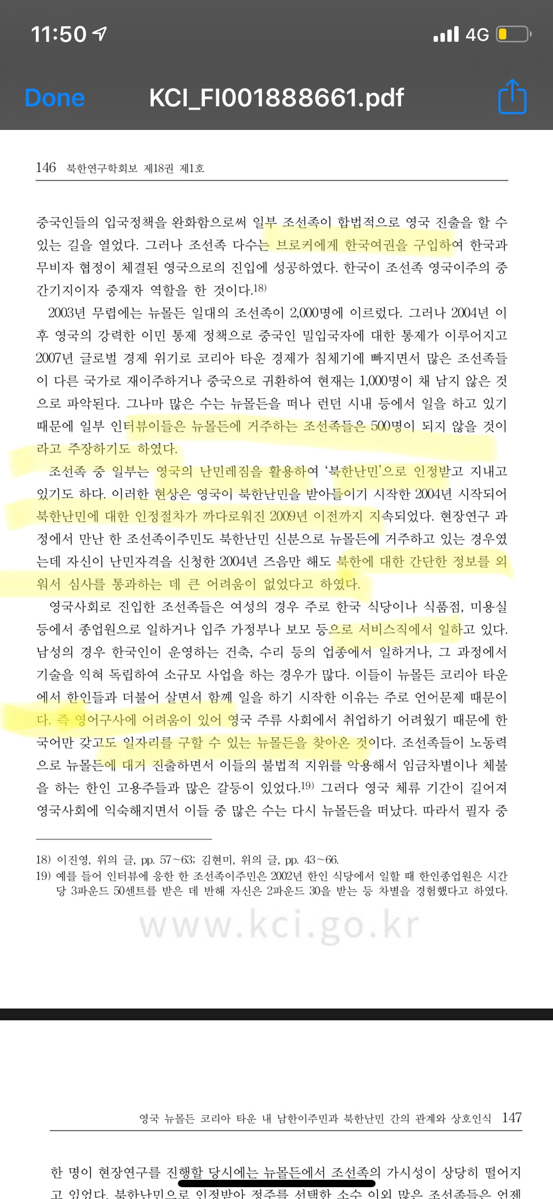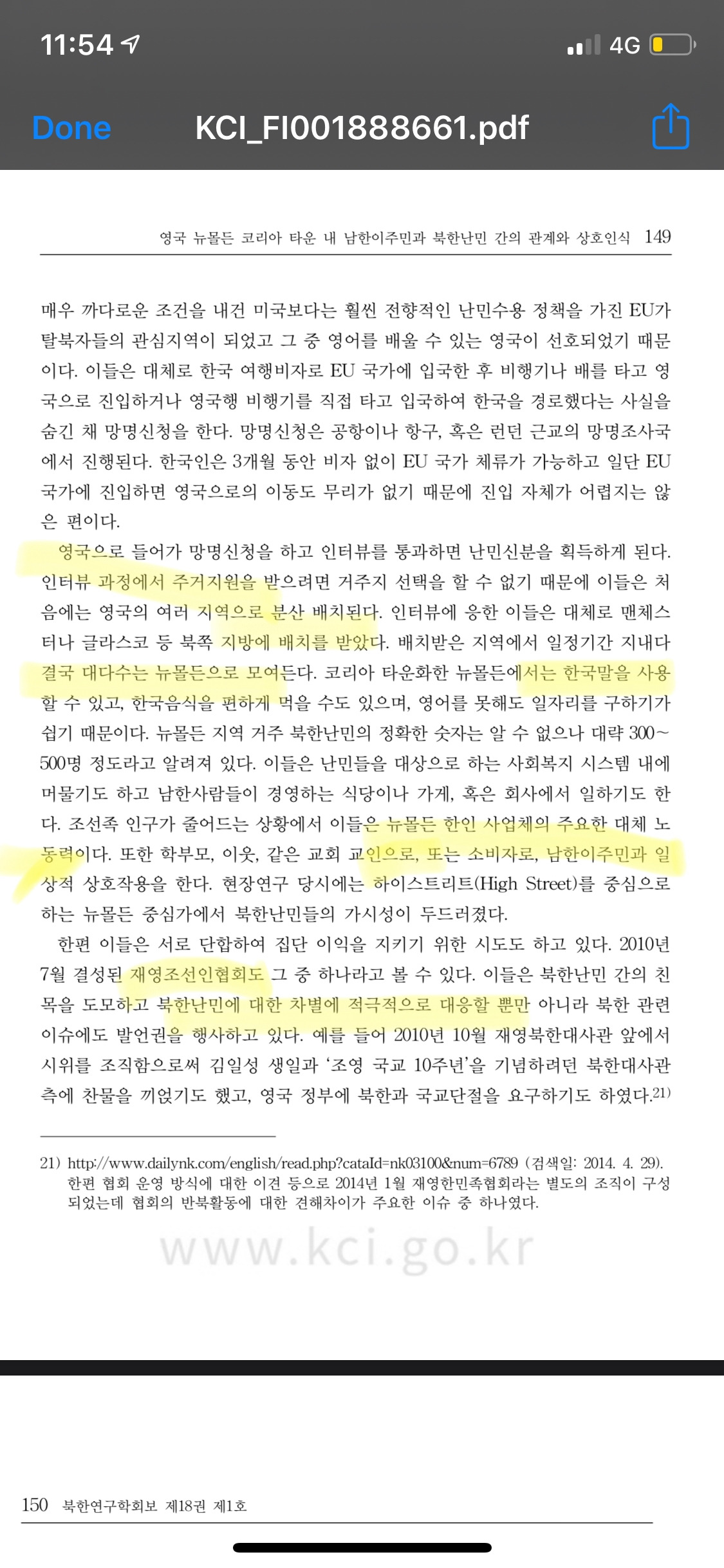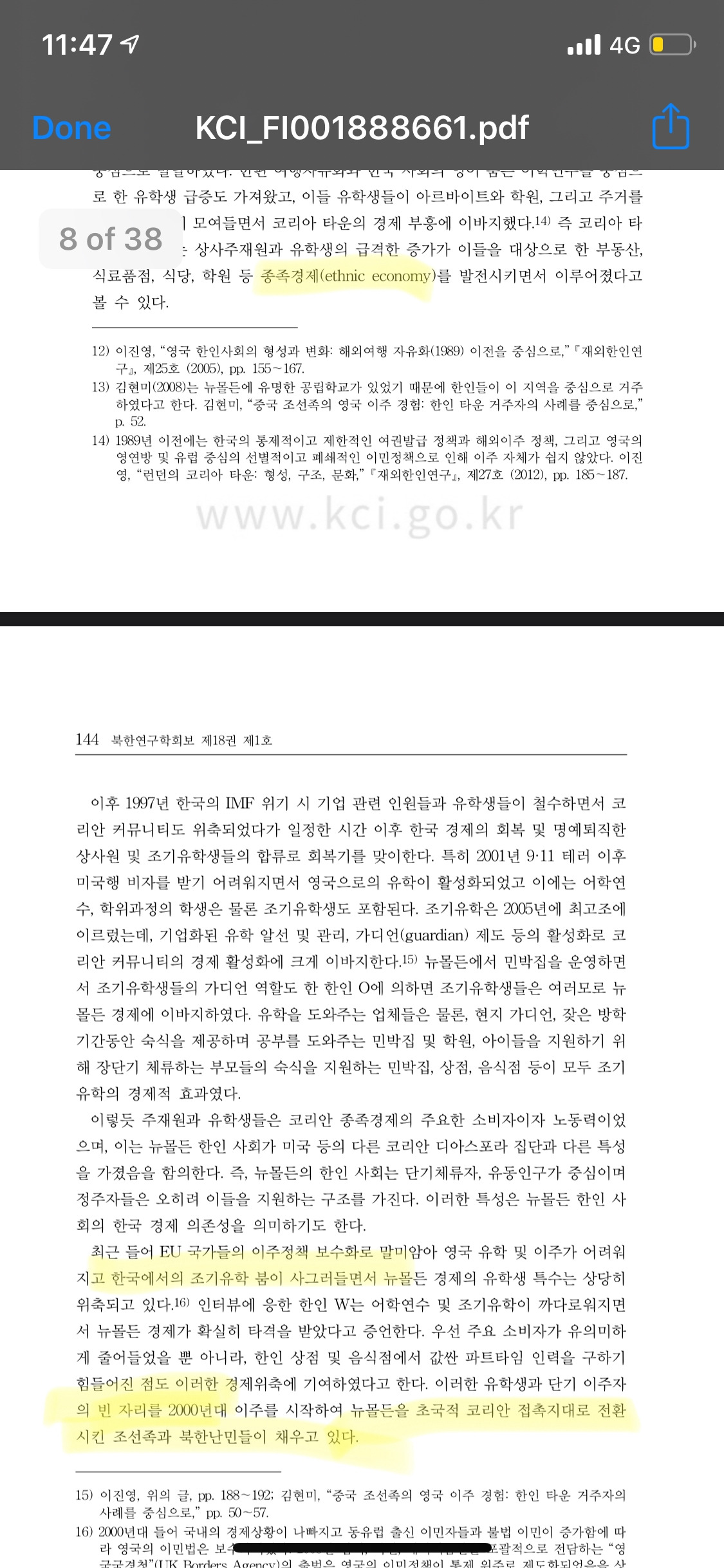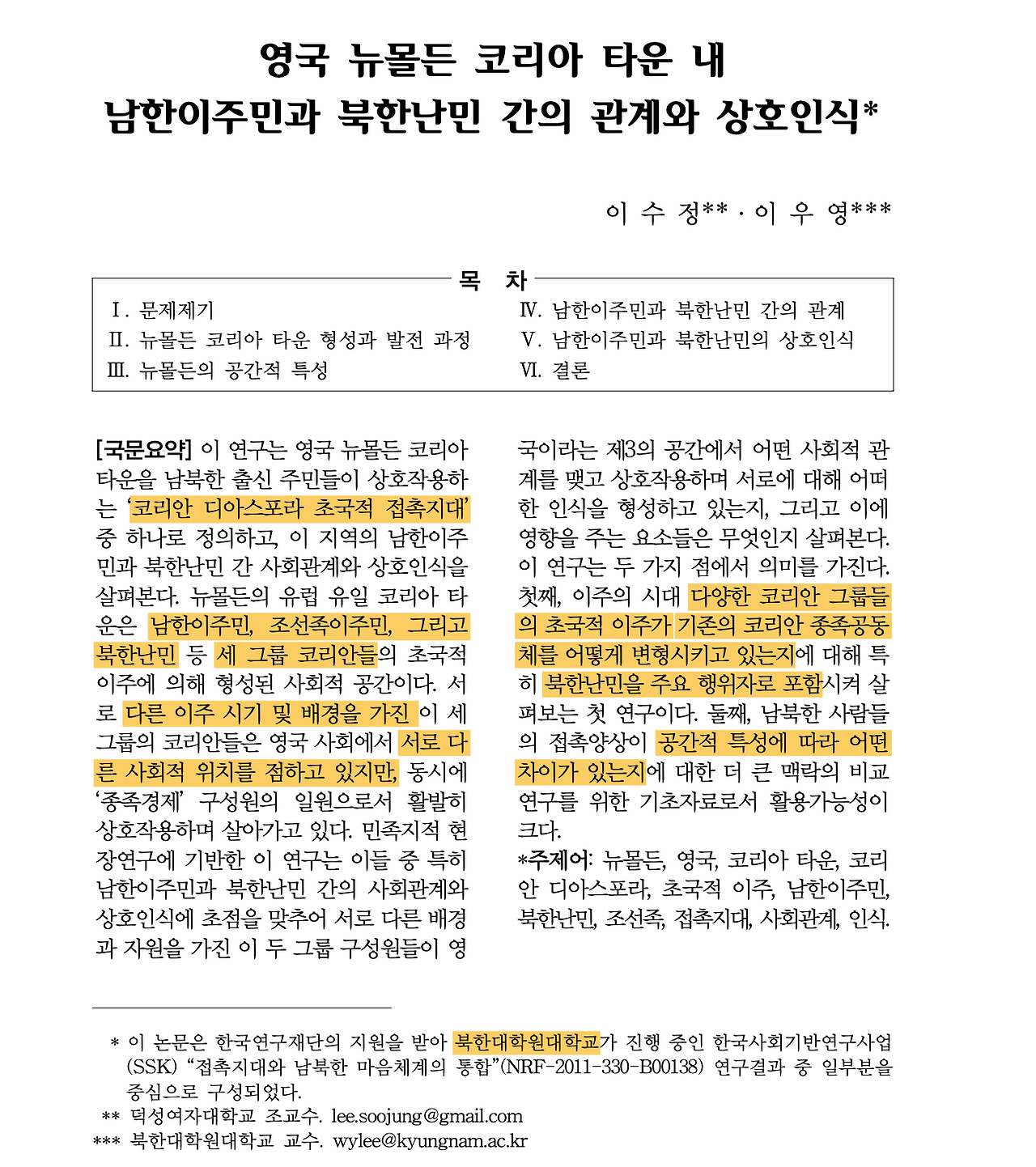 이수정 선생님께서 내가 이 시기에 관심 가진 주제에 관한 글을 참 많이 쓰셨다. 본래 석사라는 게 '이 주제는 아직 아무도 안 썼겠지' 하고 알고 보면 누군가는 꼭 연구했던 주제라더니. 그래도 다행이라 할지 여전히 북한 난민과 남한 이주민이 비슷한 비율로 모여 사는 이 영국의 한인타운 뉴몰든에 대한 연구가 양적으로 많지는 않다. 자료 출처가 거의 이수정 선생님뿐.