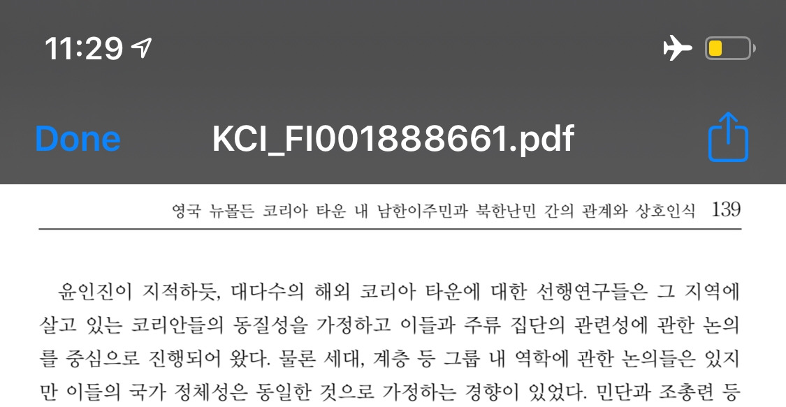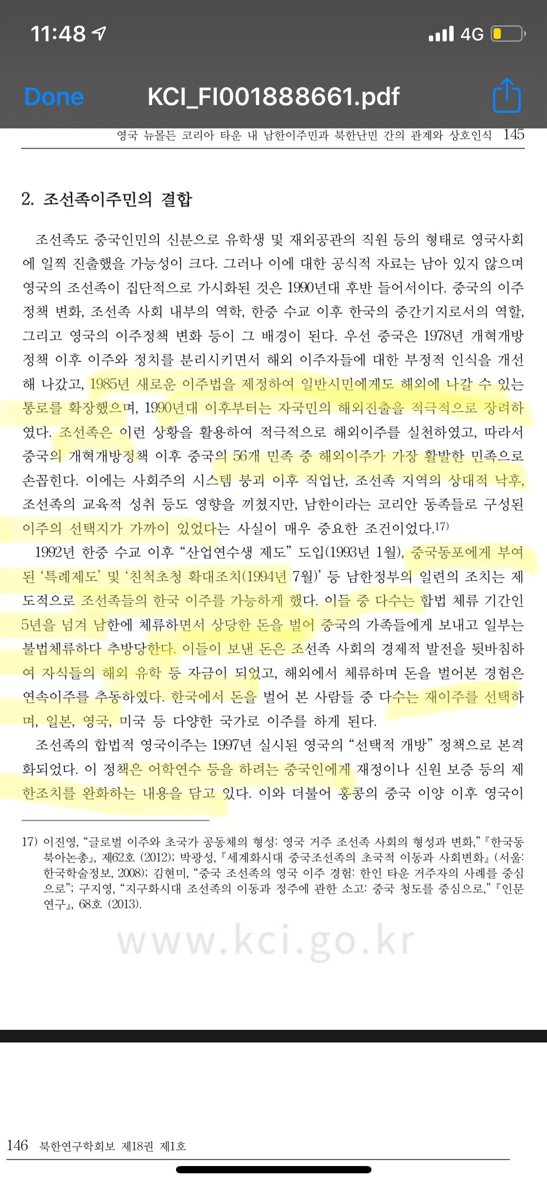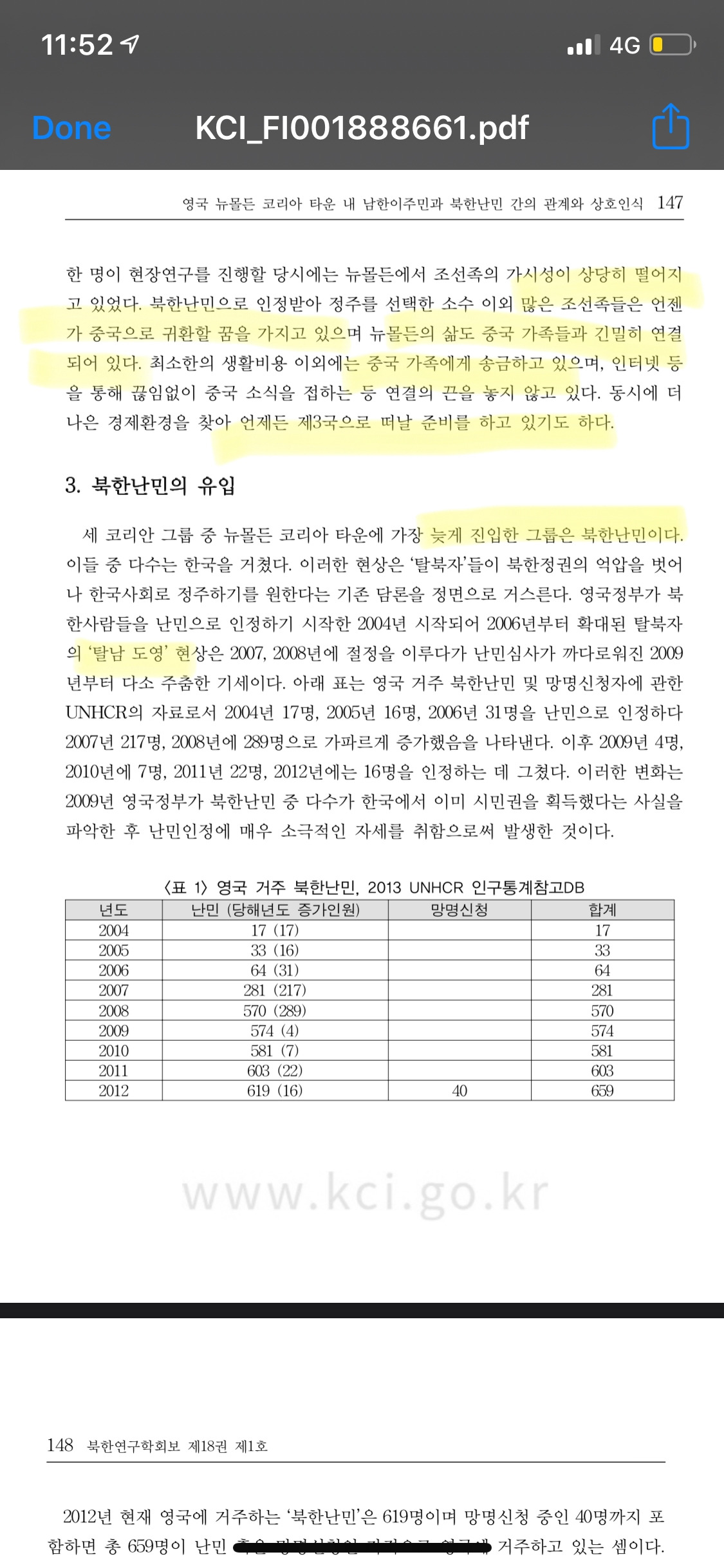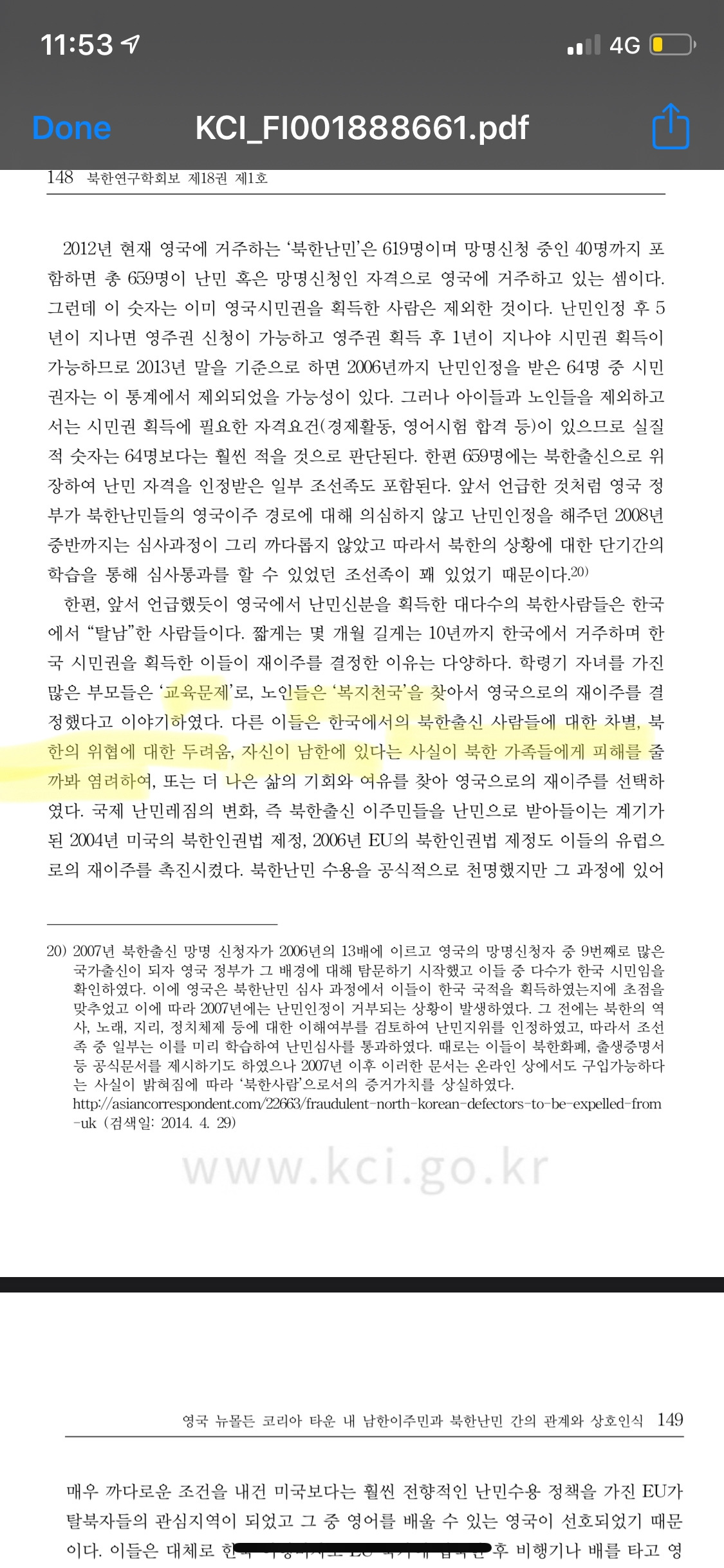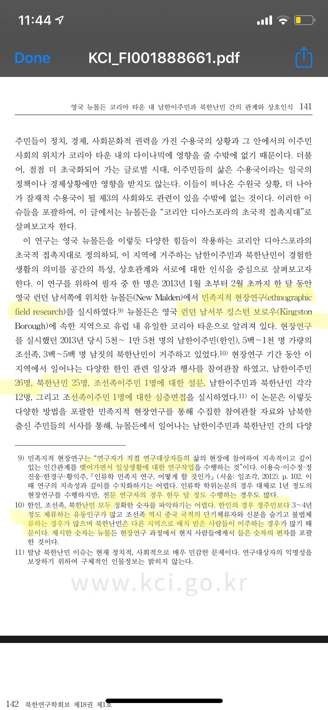 이수정 선생님께서 내가 이 시기에 관심 가진 주제에 관한 글을 참 많이 쓰셨다. 본래 석사라는 게 '이 주제는 아직 아무도 안 썼겠지' 하고 알고 보면 누군가는 꼭 연구했던 주제라더니. 그래도 다행이라 할지 여전히 북한 난민과 남한 이주민이 비슷한 비율로 모여 사는 이 영국의 한인타운 뉴몰든에 대한 연구가 양적으로 많지는 않다. 자료 출처가 거의 이수정 선생님뿐.
