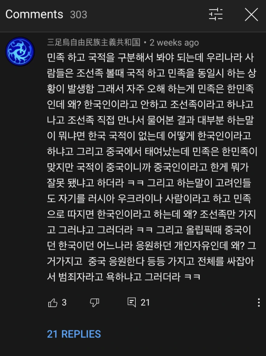 탈북민들에 대한 궁금증은 이어 조선동포분들에 대한 궁금증으로 돌아왔고, 조선동포 분과 관련한 동영상을 볼 때는 댓글을 많이 봤다. 댓글 다는 사람들이 보편적 대중이라고 일반화하긴 비약이 있으나 그래도 사람들이 어떤 인식을 가지고 있는지 좋은 자료가 되니까. 그중 흥미로웠던 댓글. 조선동포분은 민족은 조선족, 그말따나 조선 민족인데 국적은 중국인인 거다.