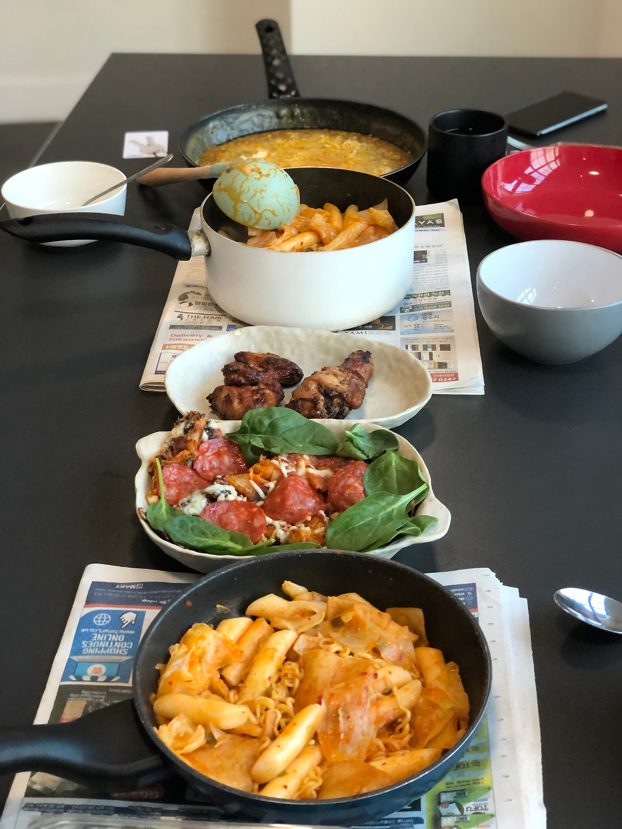 나는 떡볶이를 저렇게나 많이 하고, 필립포는 카레였던가, 준은 marinated 한 치킨과 페퍼로니가 올라간 김치전을 했다. 저 치킨은 실온에 3일째 꺼내놓아져 있던 거라 그 사실을 알고 있던 필립포 쇼니아 그리고 나 모두 손도 안 댐.. 중국인 준은 정말 음식에 대한 위생관념이 나와 달랐다.