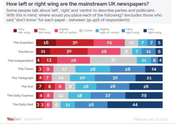 친구에게 한국이 조중동 /한겨레, 경향 이렇게 나뉘어 있듯 신문사마다 편파적인 성향이 여기도 있을 것 같은 데 어떻게 되냐고 물어봤었다. 그렇게 찾아본 아래 내용.