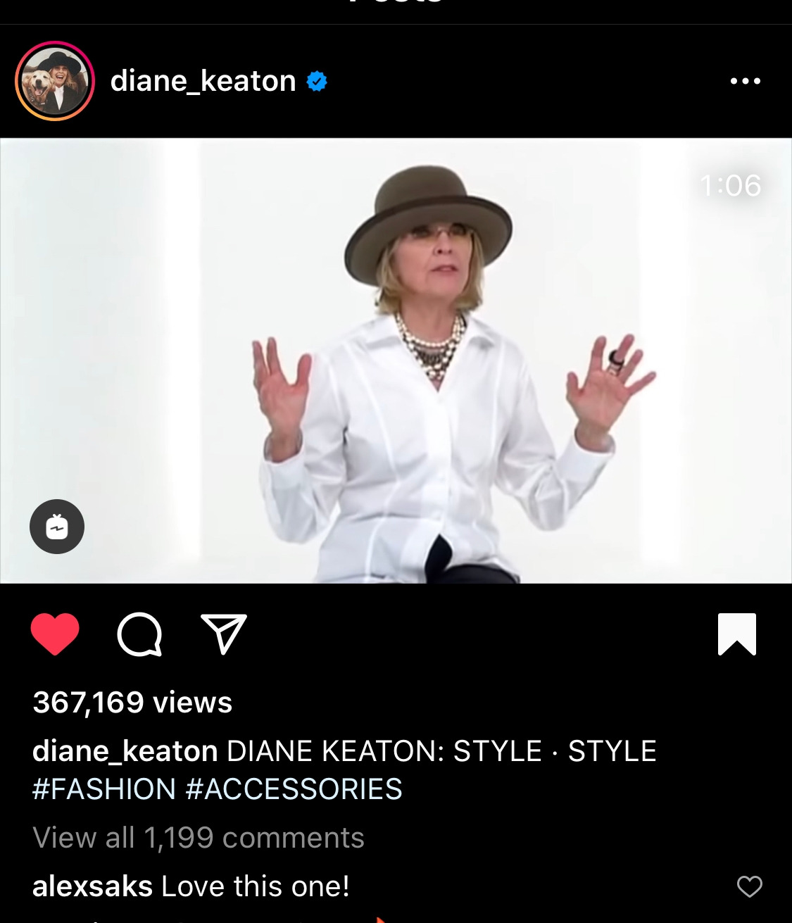 우디 앨런의 영화 <애니 홀>에 나왔던 배우며 비교적 최근 영화로는 <사랑할 때 버려야 할 아까운 것들> 이 있다. 난 두 영화 모두 좋아하는데다, <애니 홀>의 다이앤 키튼은 아이코닉했다. 톰보이룩으로 센세이셔널했던 배우인데 그게 캐릭터 덕이며 코디의 역할이 컸던 건 줄 알았다. 물론 그것도 맞겠지만, 다이앤 키튼 본인 자체가 워낙 패셔너블하더라. 46년생, 76살인데도 불구하고 인스타에 가보면 젊은 사람 같다. 옷도 개성 있게 잘 입고 밈같은 것도 종종 활용하고 코멘트들도 보면 어쩜 그렇게 러블리한 지. 다이앤 키튼 인스타 들어가서 그녀의 옷 한번 구경해주세요 한국에 윤여정 선생님이 있다면 영국엔 다이앤 키튼이.