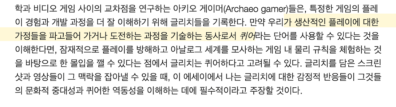 이때 현대 학계에서는 glitch 가 핫한 화두였다. 가상세계에서의 몰입을 깨는 매개인 글리치.