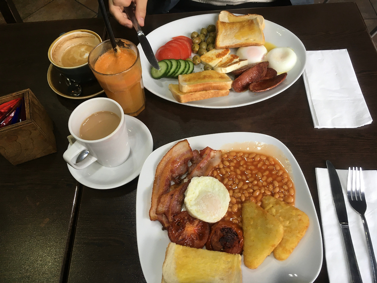 요리라 할 게 없이 그냥 계란, 토마토, 베이컨, 냉동 해쉬브라운, 그리고 베이크드 빈스 통조림을 부어주고 빵에는 마가린 듬뿍, 여기다가 우유 넣은 티나 커피를 같이 먹는다. 펍 만큼이나 런던 길거리에서 자주 볼 수 있는 곳.