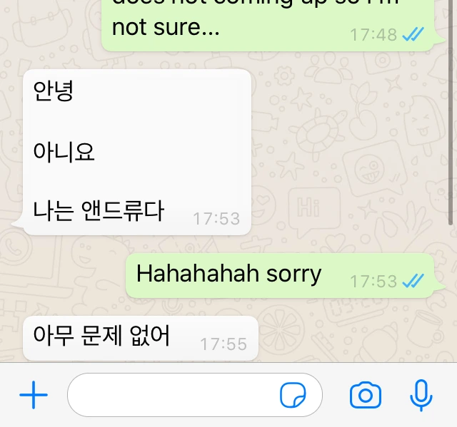 당시 내 방에 아직 인터넷이 없었는데 랜드로드가 다른 방에 거주 중인 막달리니의 인터넷을 같이 써라고 했었다. 그래서 하우스 단톡방에서 막달리니 인가 싶어 번호를 찾아 연락했더니 또다른 하우스 메이트인 앤드류가 저렇게 답을 보내왔다. ㅋㅋㅋ 번역기 쓰는 데 저렇게 귀여울 일. 영국에서 습관적으로 하는 No problem 이 한국어로 하면 저렇게 되는구나 "아무 문제없어"
