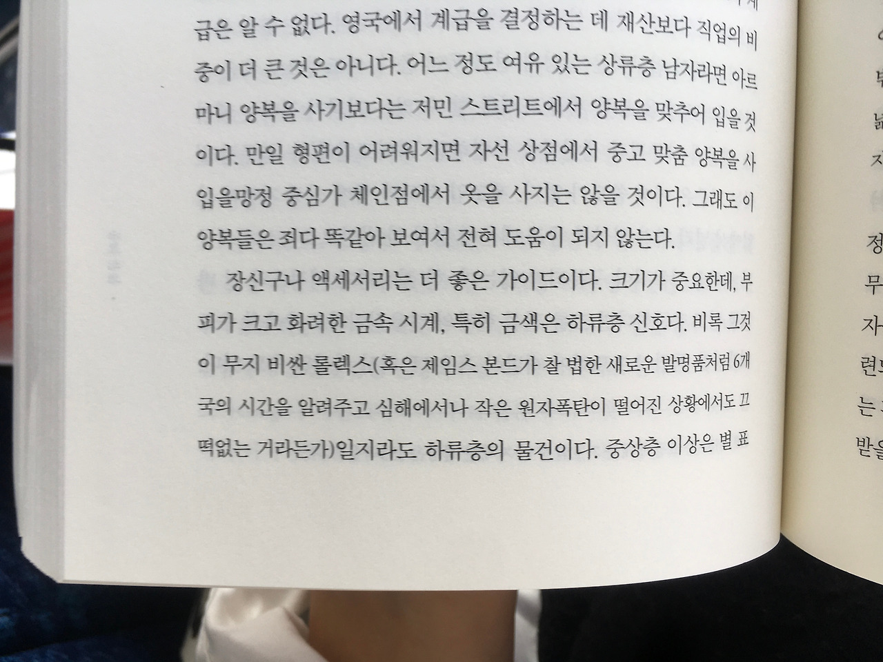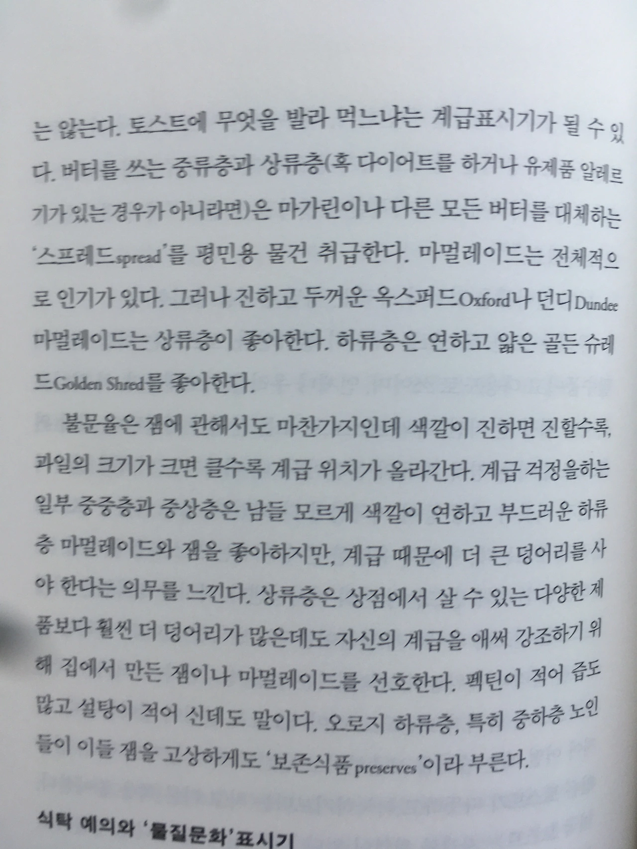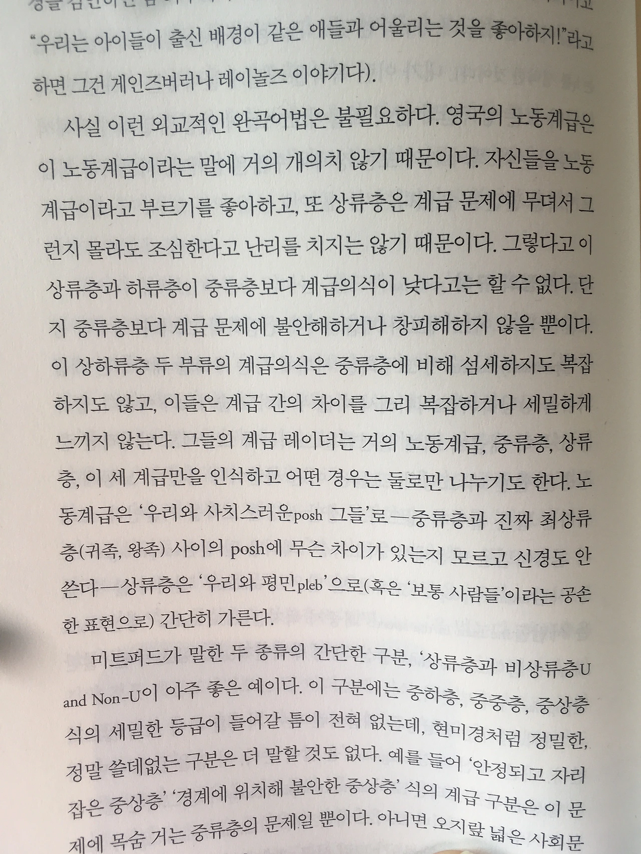 따라서 현실은 흥미롭게도 상류층과 워킹클래스는 자신들의 계급 뿌리로부터 오는 문화에 개의치 않고 오히려 본인을 색을 전면에 들어내는 반면, 중산층은 이런 계급의식에서 가장 취약하고 이를 민감하게 받아들인다. 개인적으로 한국 사회 대부분의 사람들이 이런 중산층의 사고에 매몰되어 있지 않나 싶다.