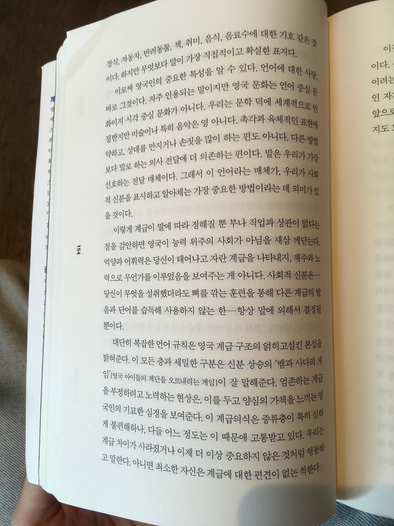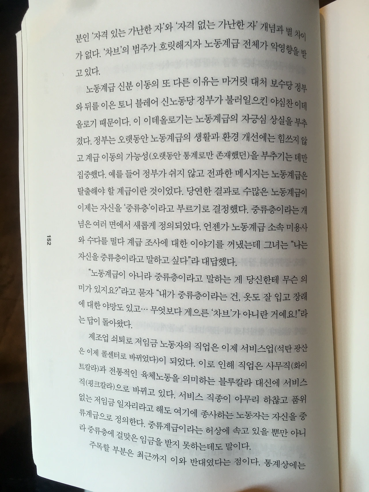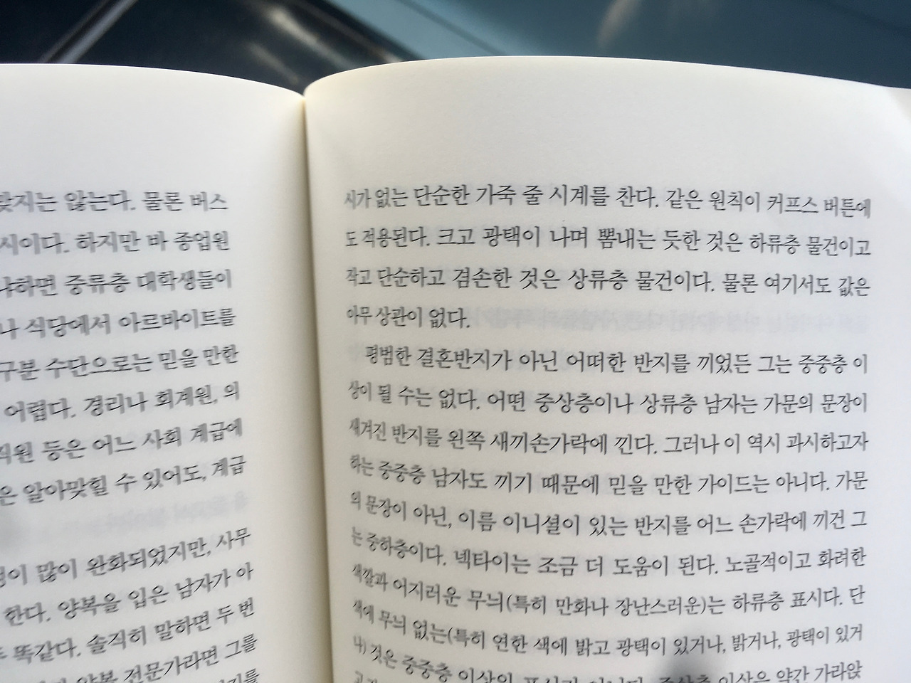 따라서 현실은 흥미롭게도 상류층과 워킹클래스는 자신들의 계급 뿌리로부터 오는 문화에 개의치 않고 오히려 본인을 색을 전면에 들어내는 반면, 중산층은 이런 계급의식에서 가장 취약하고 이를 민감하게 받아들인다. 개인적으로 한국 사회 대부분의 사람들이 이런 중산층의 사고에 매몰되어 있지 않나 싶다.