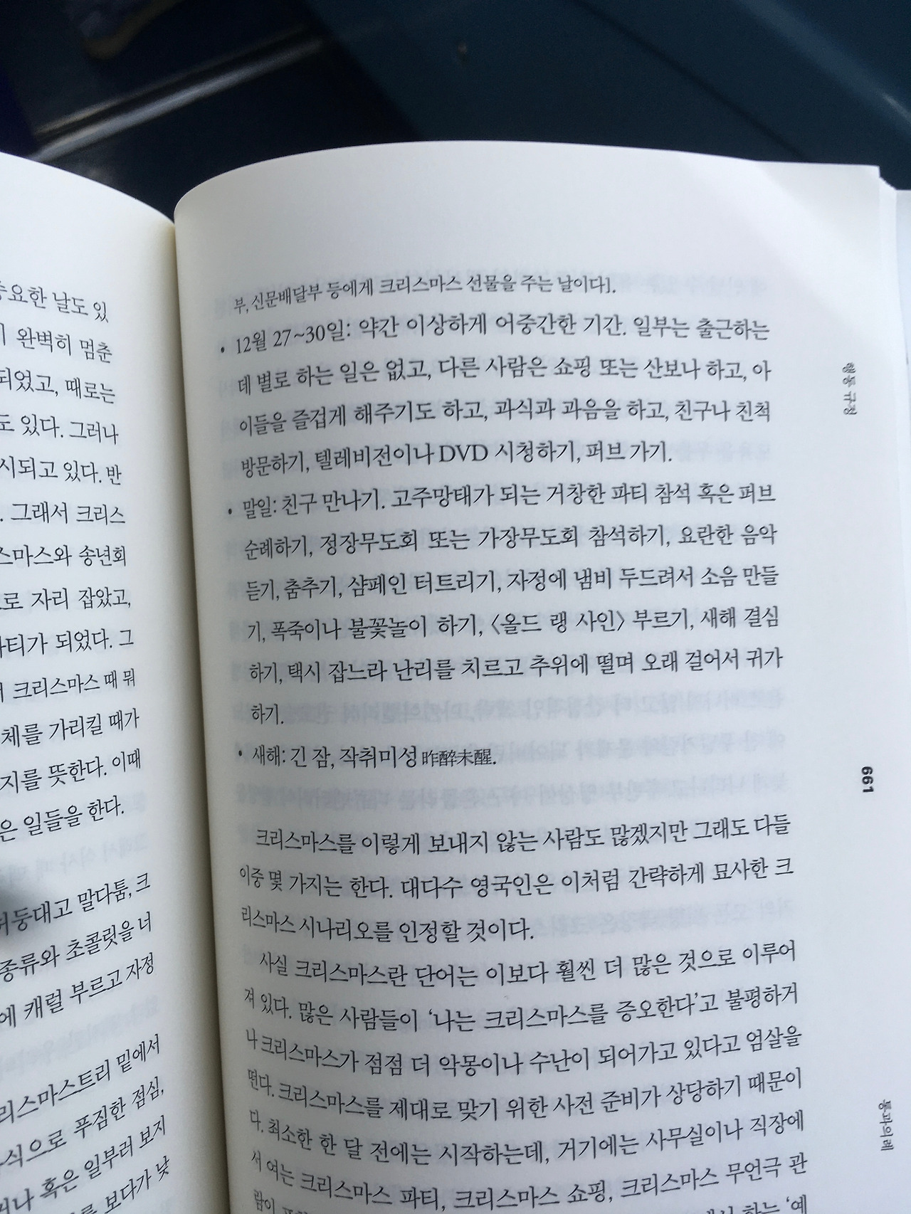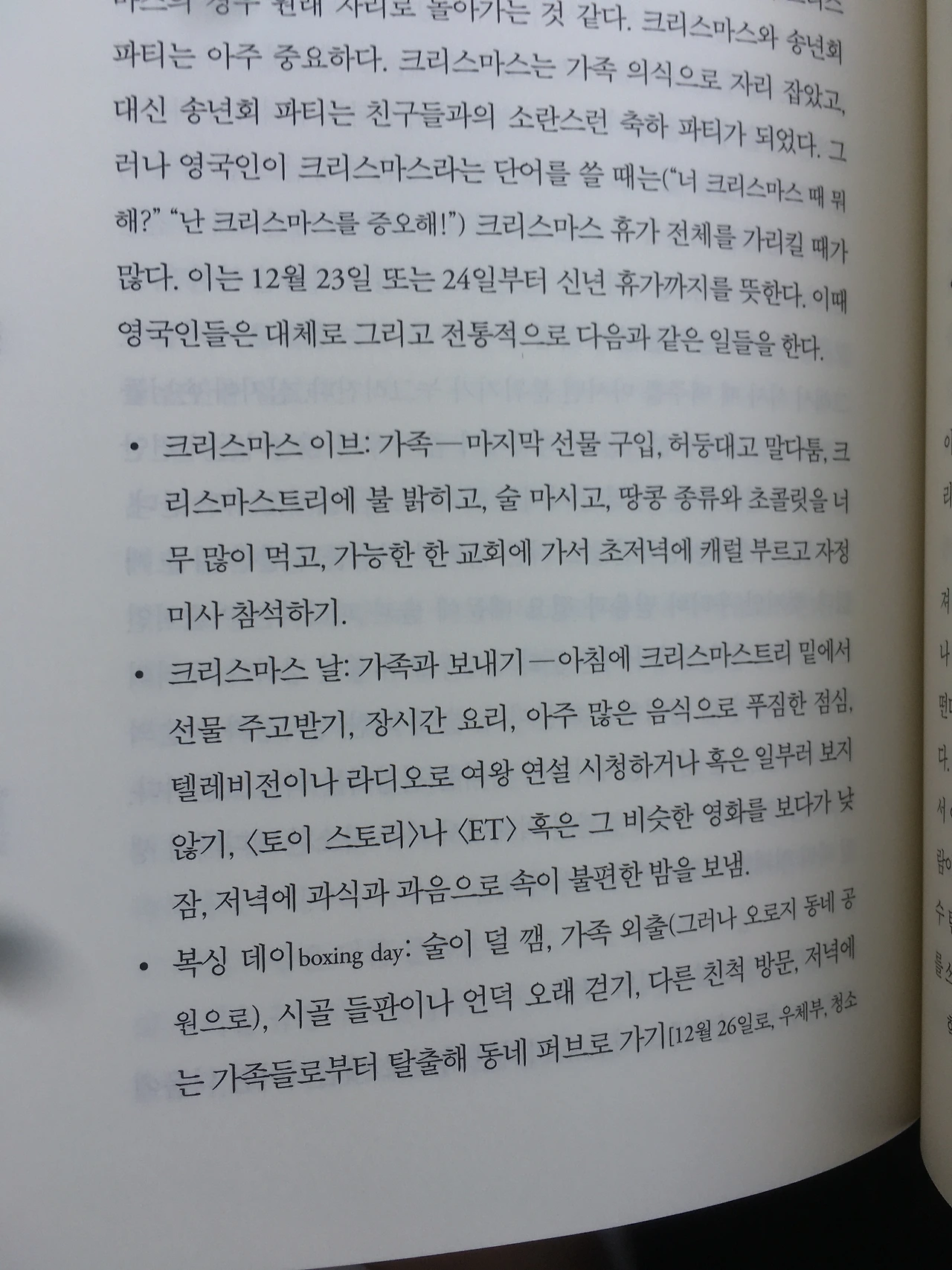 한국 설날과 비슷한 영국 크리스마스. 특히 크리스마스이브에 '허둥대고 말다툼', 너무 설 전날 가족 싸움과 비슷한 거 아니냐며 ㅋㅋ 그러고 보면 한국 문화에 대해 한국인 인류학자가 쓴 책도 읽어보고 싶다는 생각이 든다.