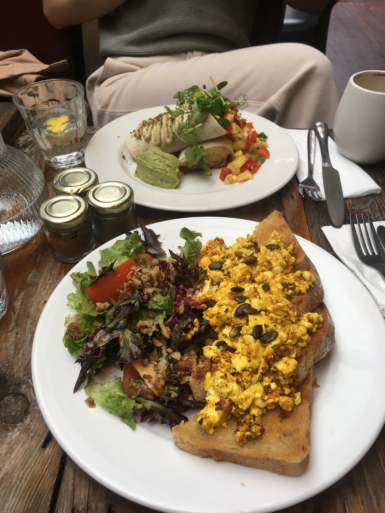 친구랑 비건 브런치, 두부와 사워 도우라니 안 어울릴 것 같은 조합인데 무척 맛있었다.