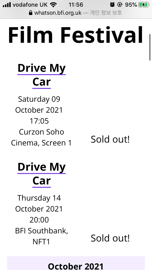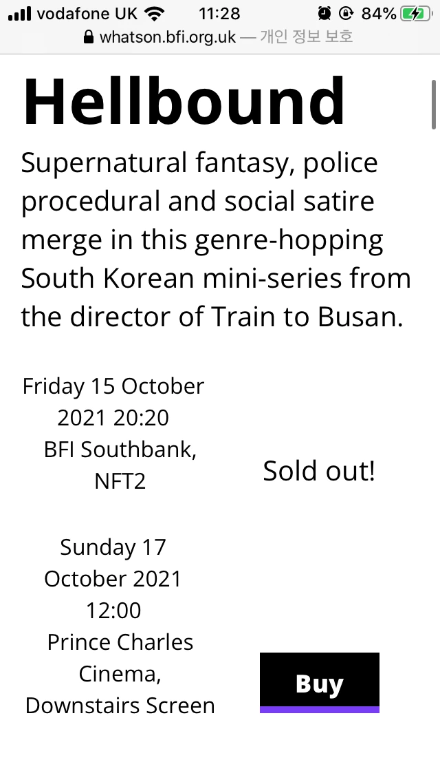 오늘 만난 친구는 전공이 컴퓨팅 아트인데 나처럼 시네필이기도 하다. 그래서 만나면 반은 영화 얘기로 수다를 채운다. 이 날은 친구가 런던 영화제 예약했냐고 해서 부리나케 들어가 봤더니 보고 싶었던 Drive my car는 이미 매진되었더라. 그 외도 다른 영화도 죄다 매진이고 그나마 한국 영화 하나 있길래, 런던에서 자막 없이 영화 보는 게 어디야 하고 예매했다.