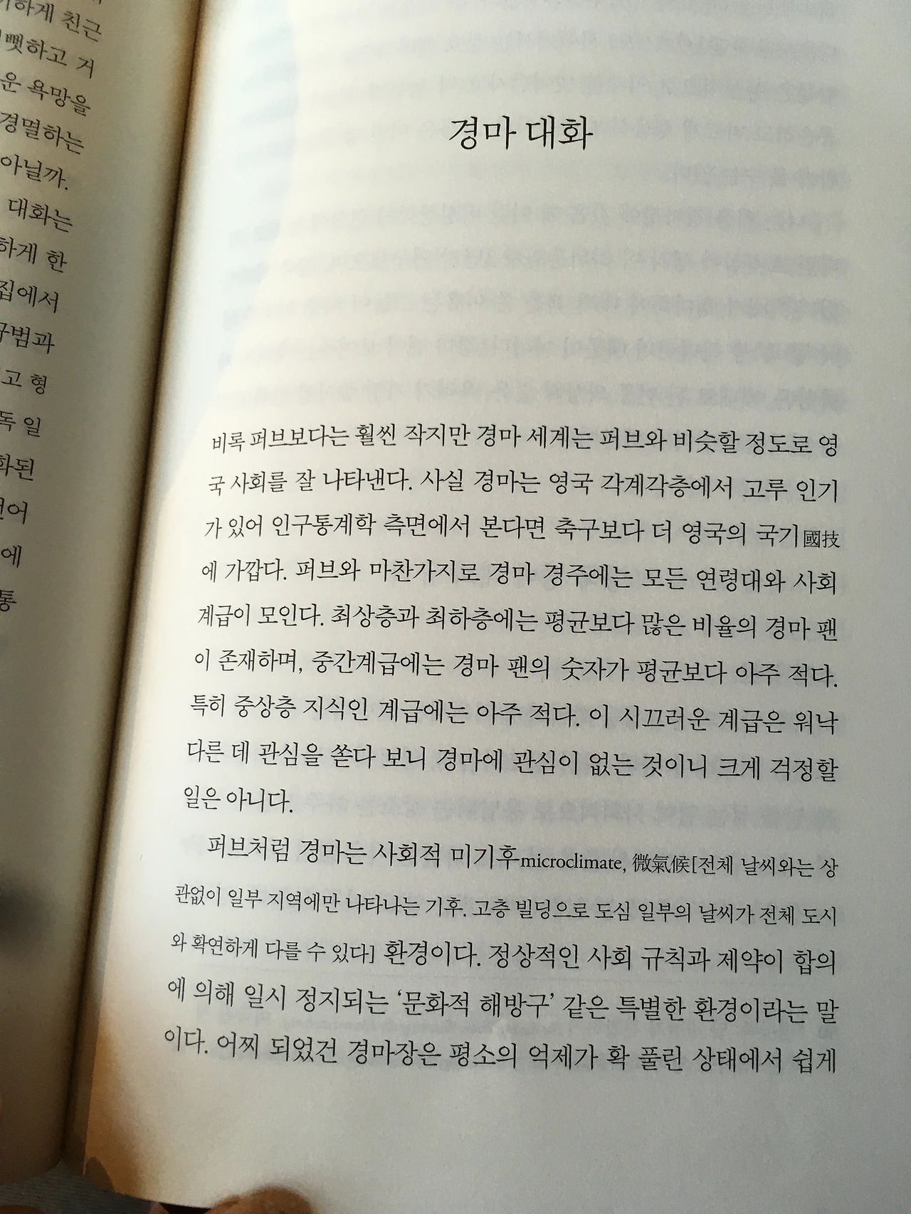 이 책에서도 내내 설명하지만, 상류층과 워킹 클래스는 자신의 문화와 계급에 개의치 않는 반면, 중산층 계급은 이를 민감하게 받아들인다. 그러니까 가장 자기 계급에 불만이 많고 민감하게 반응하며, 상류층 언어를 구사하고 싶어 하는 계급은 노동계급이라고 생각하는 것은 한국 사람들의 착각이다. 그래서 아래 책이 경마를 설명할 때 언급한 것처럼, 오히려 상류층과 하류층이 공통으로 좋아하는 스포츠가 더 많다.